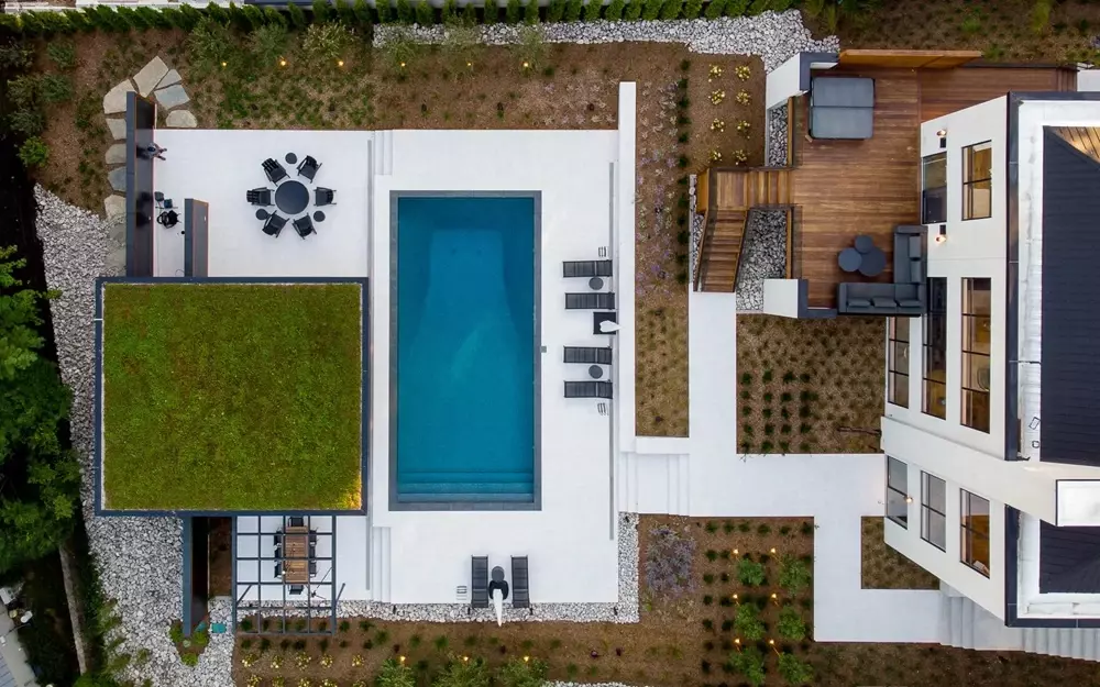 Kiedy promienie słońca odbijają się od jasnej powierzchni, biały taras przy basenie zamienia się w miejsce, gdzie czas płynie wolniej.