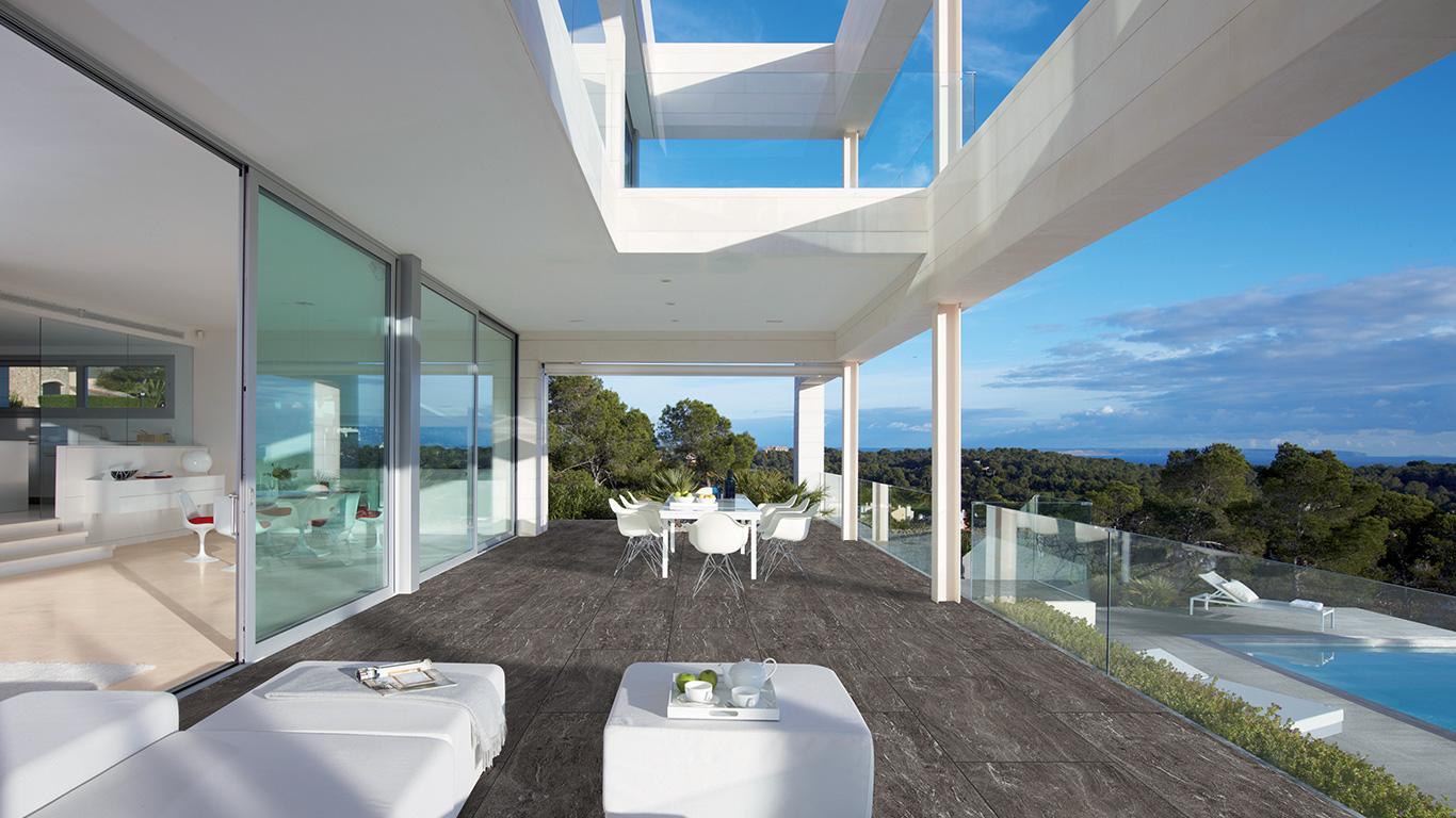 Zdjęcie z salonu Płytka DUOMO Valstone Dark to ciemna płytka tarasowa inspirowana kamieniem z Vals, znanym jako Dark. Głęboka grafitowo-szara baza z chłodnym stalowym tonem nadaje tarasowi spójny i naturalny charakter, a jednocześnie praktycznie maskuje zabrudzenia i ślady użytkowania. Subtelne, nieregularne żyłkowanie oddaje warstwową strukturę skały, a matowe, lekko strukturalne wykończenie zapewnia przyjemny dotyk i antypoślizgowość. DUOMO Valstone Dark łączy wytrzymałość kwarcytu z funkcjonalnością na zewnątrz.