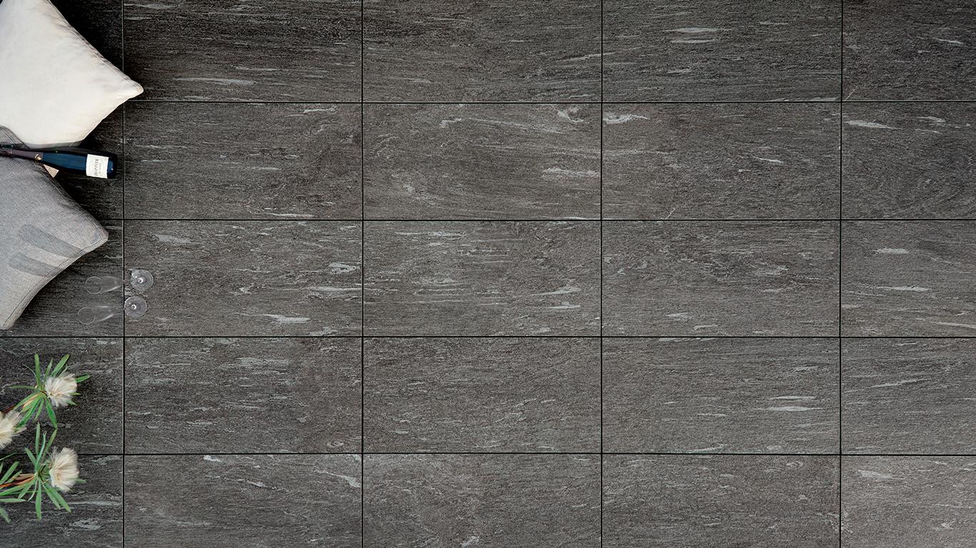 Zdjęcie z salonu Płytka tarasowa w kolorze ciemnym, która łączy wizualną moc gór. Odwzorowuje szwajcarski ciemny granit, mieszankę głębokich odcieni czerni i szarości nawiązujących do alpejskiego krajobrazu. Płytka w wykończeniu posiada delikatne, nieregularne żyłki, które płyną po matowej powierzchni niczym wodne ścieżki, nadając podłogom i ścianom solidny charakter. Naturalny wzór przemienia przestrzenie mieszkalne i publiczne w eleganckie, autentyczne otoczenie.