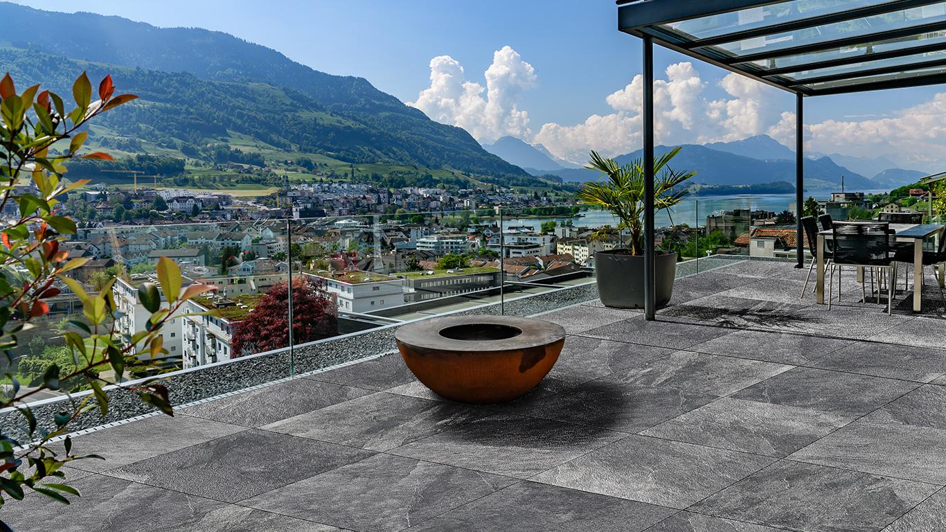 Zdjęcie z salonu Płytka tarasowa MUSEO Ardesia Nera odwzorowuje naturalny czarny łupek z Brazylii. Wzory 3d przypominające chmurki nadają powierzchni dynamikę i trójwymiarowość. Powierzchnia płytki jest gładka i zwarta, z delikatnym, naturalnym efektem kamienia, który podkreśla autentyczność i sprawia, że każda płytka wygląda unikalnie. Dedykowana na taras, balkon.
