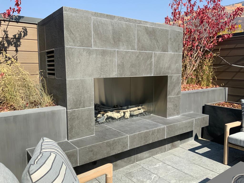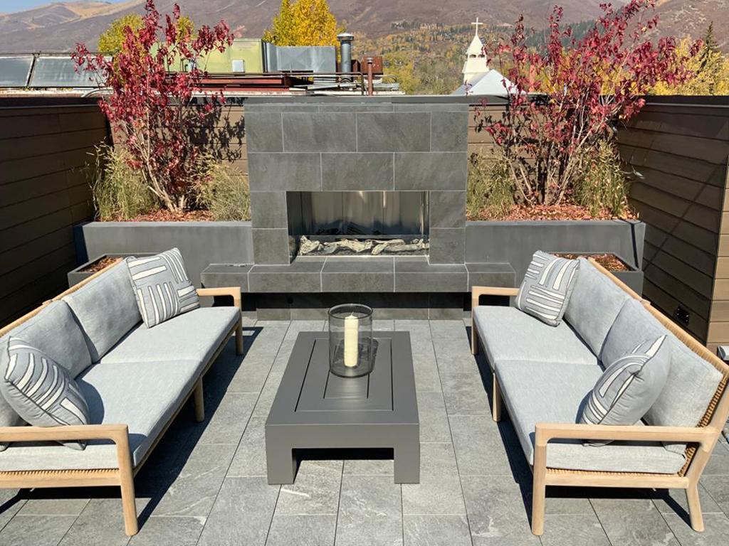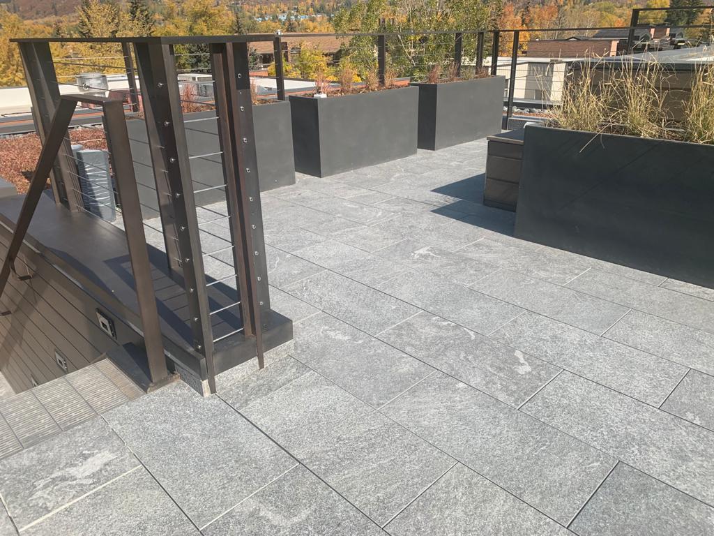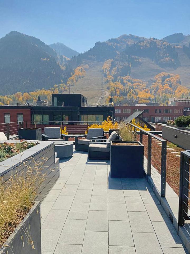Taras w Aspen w Kolorado z kostką spiekaną w dwóch różnych kolorach z kolekcji L'ALTRA PIETRA. Odporny i trwały produkt o wysokiej jakości. Płyty wybrane do projektu to L'ALTRA PIETRA Colosseo Grigioni i L'ALTRA PIETRA Castello Antrazyt.