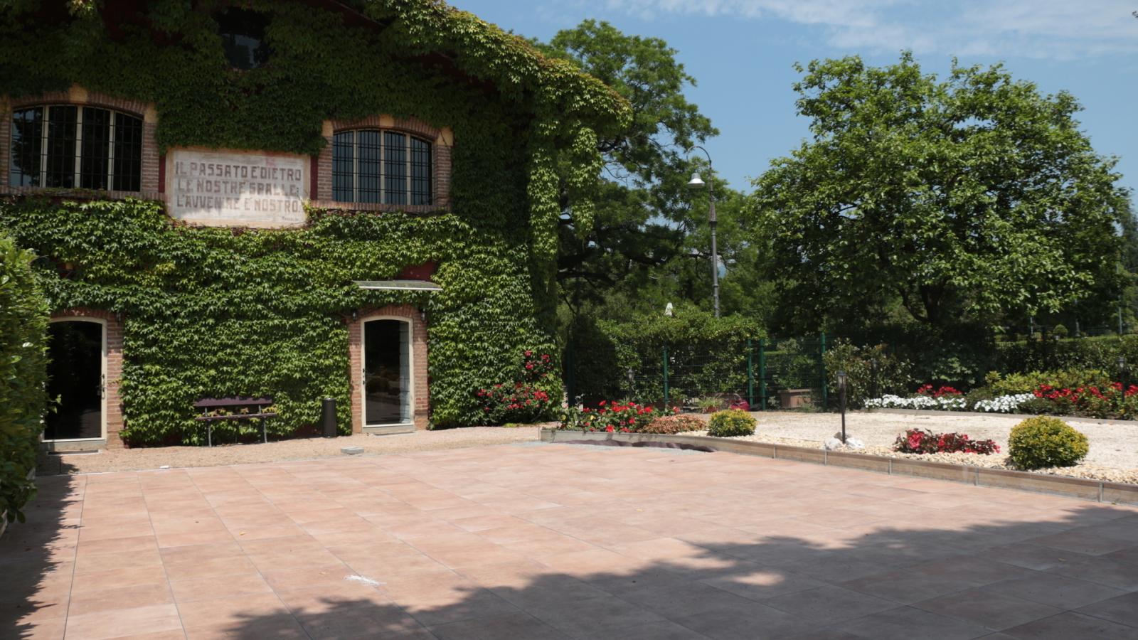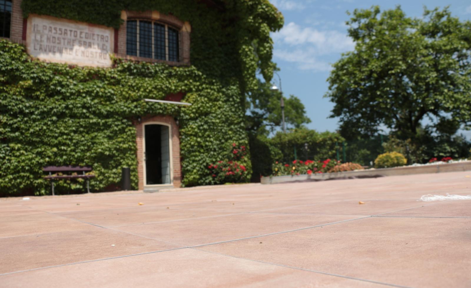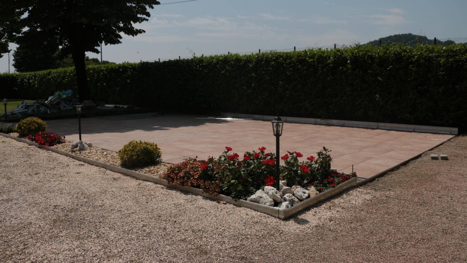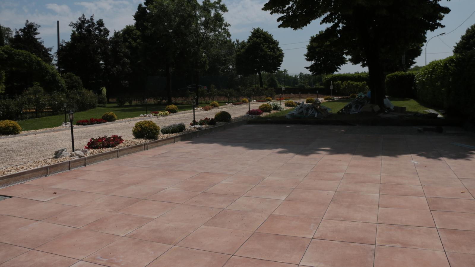 W jednym z zewnętrznych obszarów Domu w Monticelli, w Bergamo, ułożono płyty ze spiekanego kamienia L'ALTRA PIETRA, układana na sucho na żwirze.Wybrany produkt do tego projektu to HARDSCAPE PORCELANA Cemento Dolomiti Cotto 60x60 cm (24"x24").