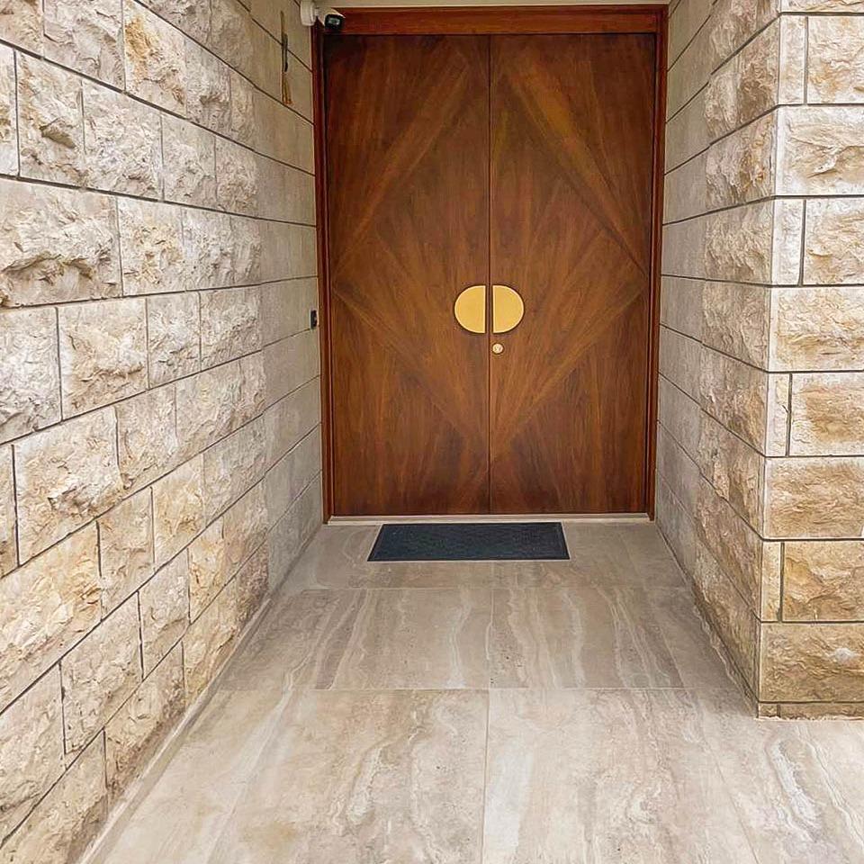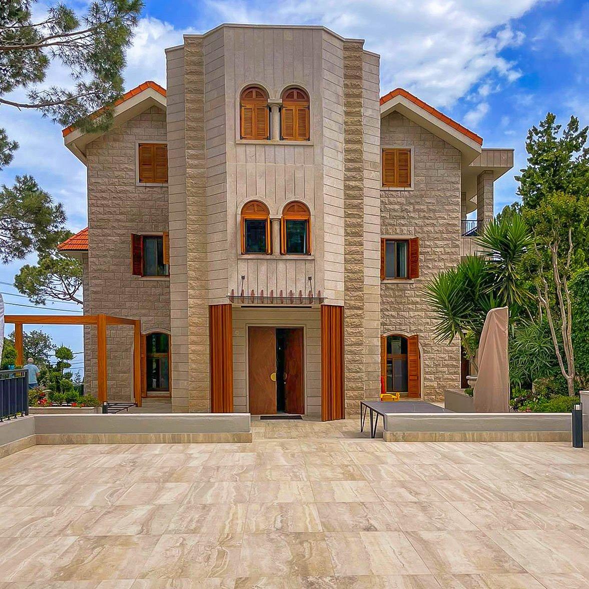 W tej realizacji elewacja z płytek trawertynowych została wykonana na systemie wentylowanym, co zapewnia doskonałą ochronę przed wilgocią, pleśnią i wahaniami temperatur. Trawertyn pojawia się nie tylko na głównych ścianach budynku, ale także w detalach – okien, kolumnach, gzymsach strefie wejścia głównego. Całość prezentuje się wyjątkowo estetycznie i luksusowo, zachowując jednocześnie funkcjonalność oraz odporność na warunki atmosferyczne.