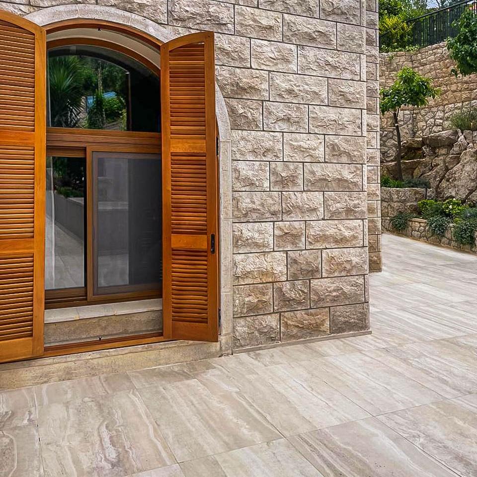 Płytki z trawertynu zostały starannie dobrane pod względem kolorystyki, struktury i formatu, by harmonijnie współgrały z architekturą domu oraz jego otoczeniem. Trawertyn w odcieniach beżu i kremu nadaje budynkowi lekkości, a jego charakterystyczna porowata powierzchnia wprowadza wrażenie naturalności i autentyczności. Zastosowanie jednego materiału na elewacji, tarasie i schodach pozwoliło uzyskać efekt jednolitej, eleganckiej przestrzeni zewnętrznej.