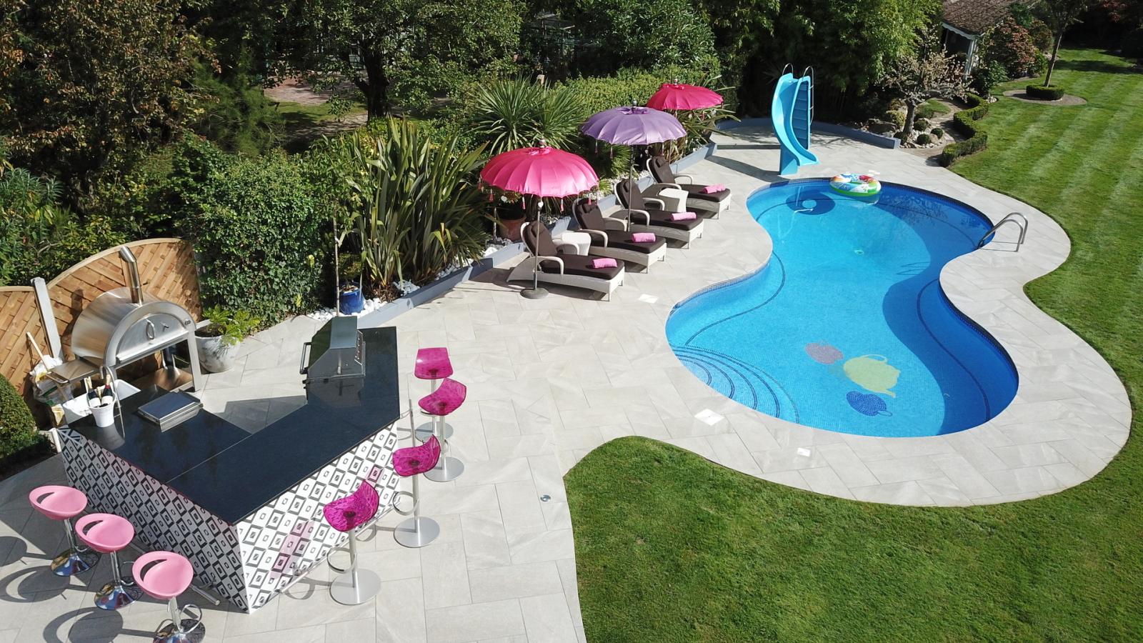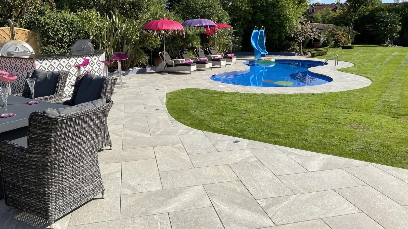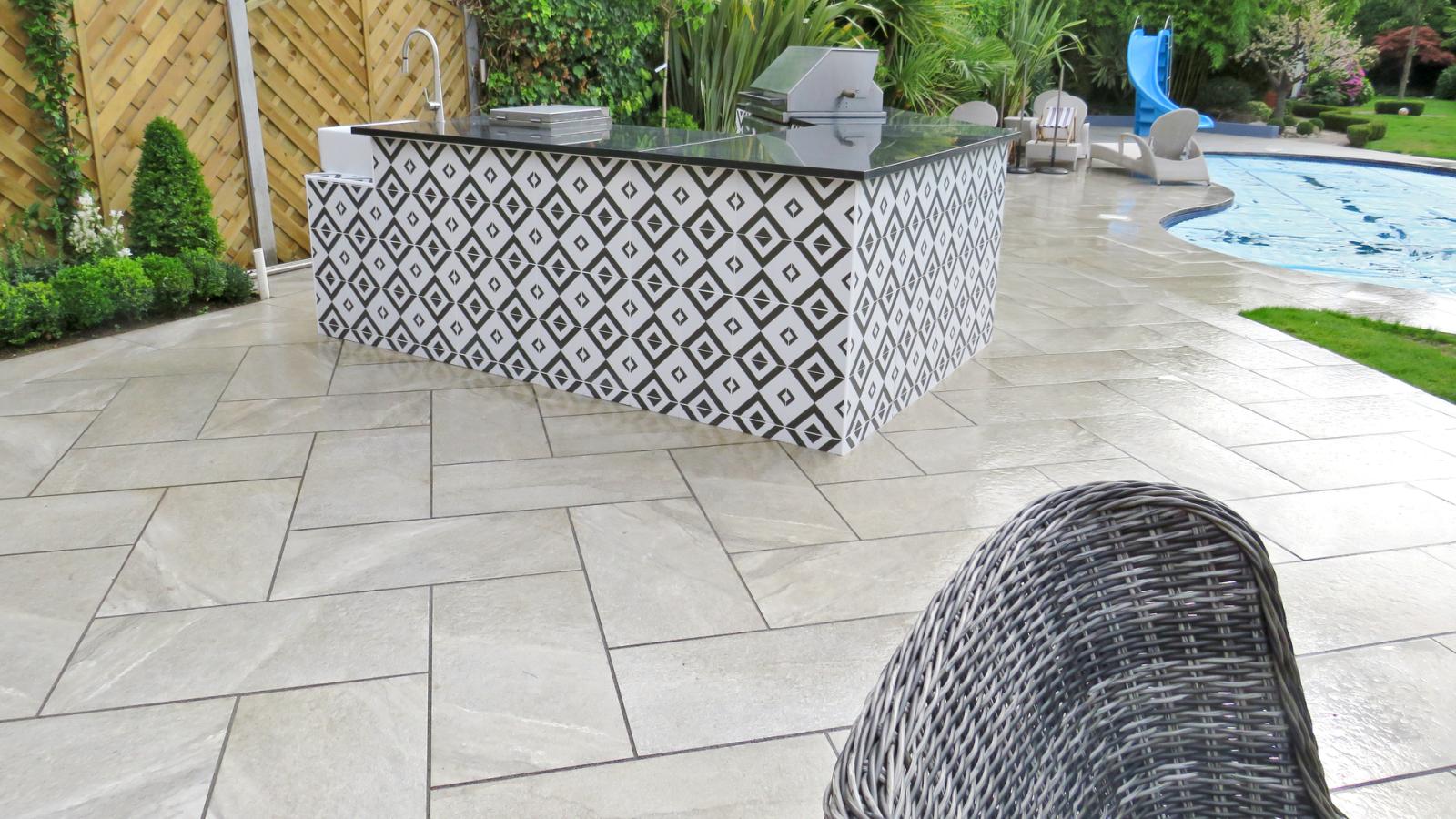 W prywatnej willi w Hornchurch, Essex, do zewnętrznej nawierzchni basenu wybrano kamień spiekany. HARDSCAPE PORCELAIN o grubości 2 cm
