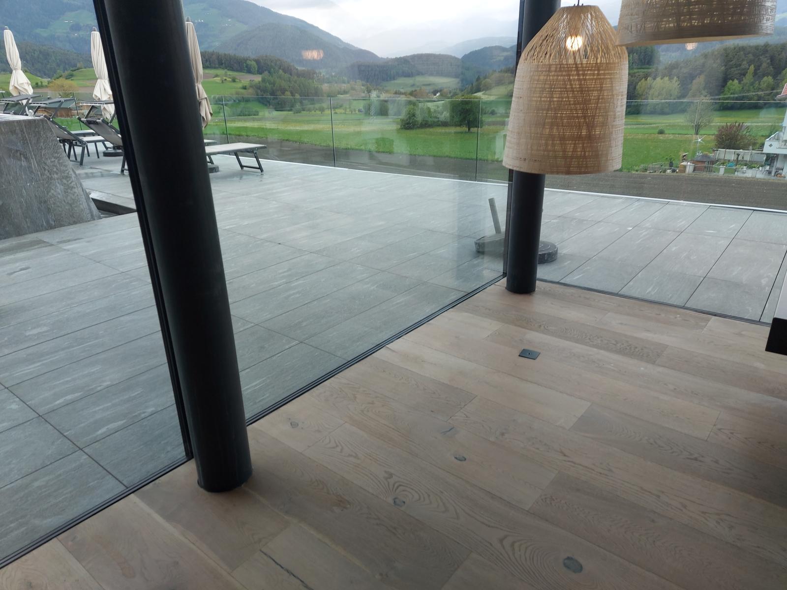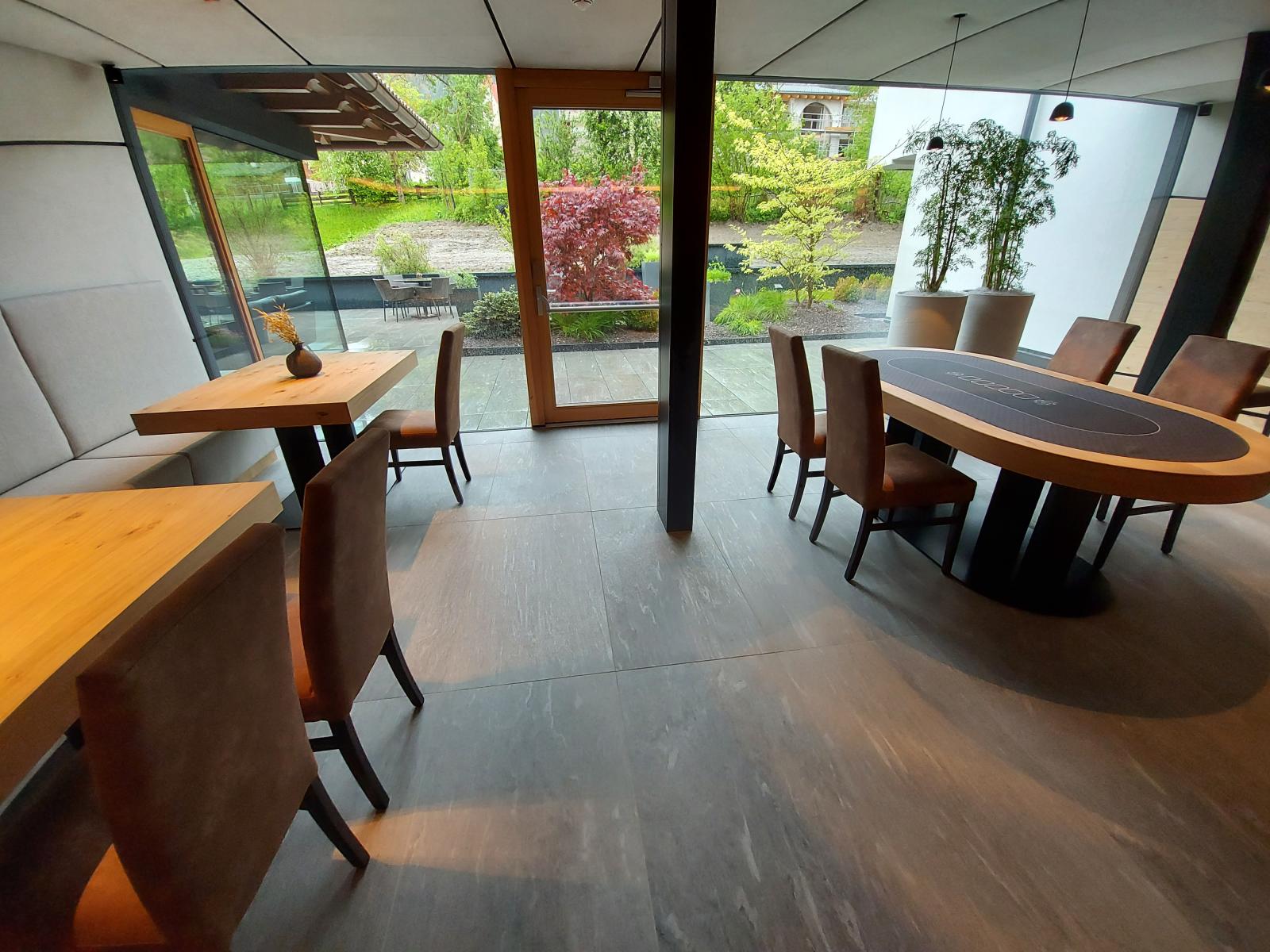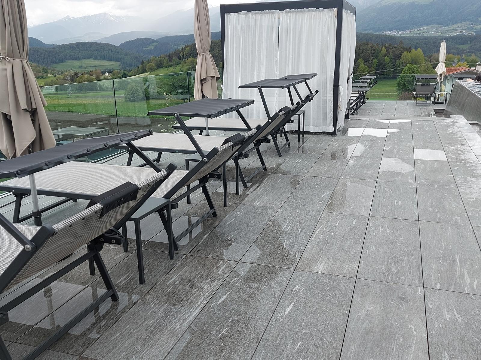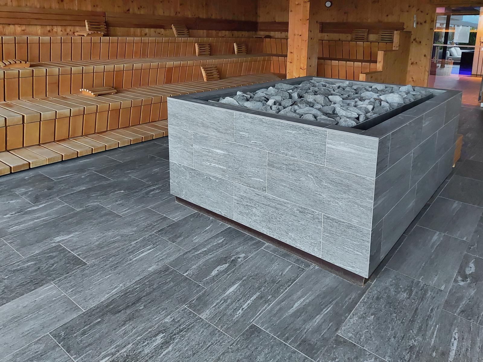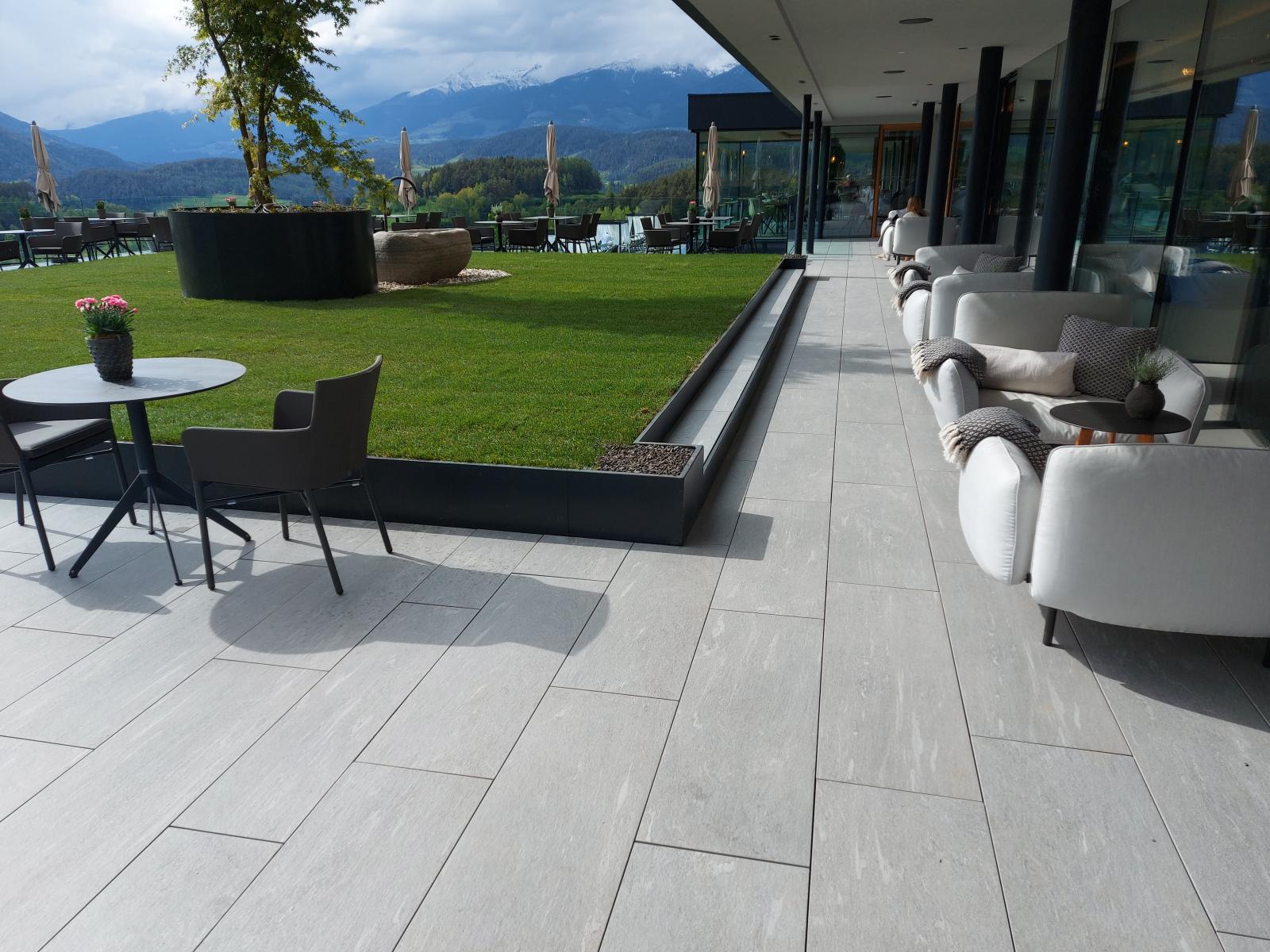 San Lorenzo di Sebato-Winkler Hotel, w którym klient zdecydował się na ułożenie posadzek wewnątrz i zewnątrz z kamienia spiekanego o grubości 2cm z wykorzystaniem kolekcji Harena calanca light Dark 40x120cm