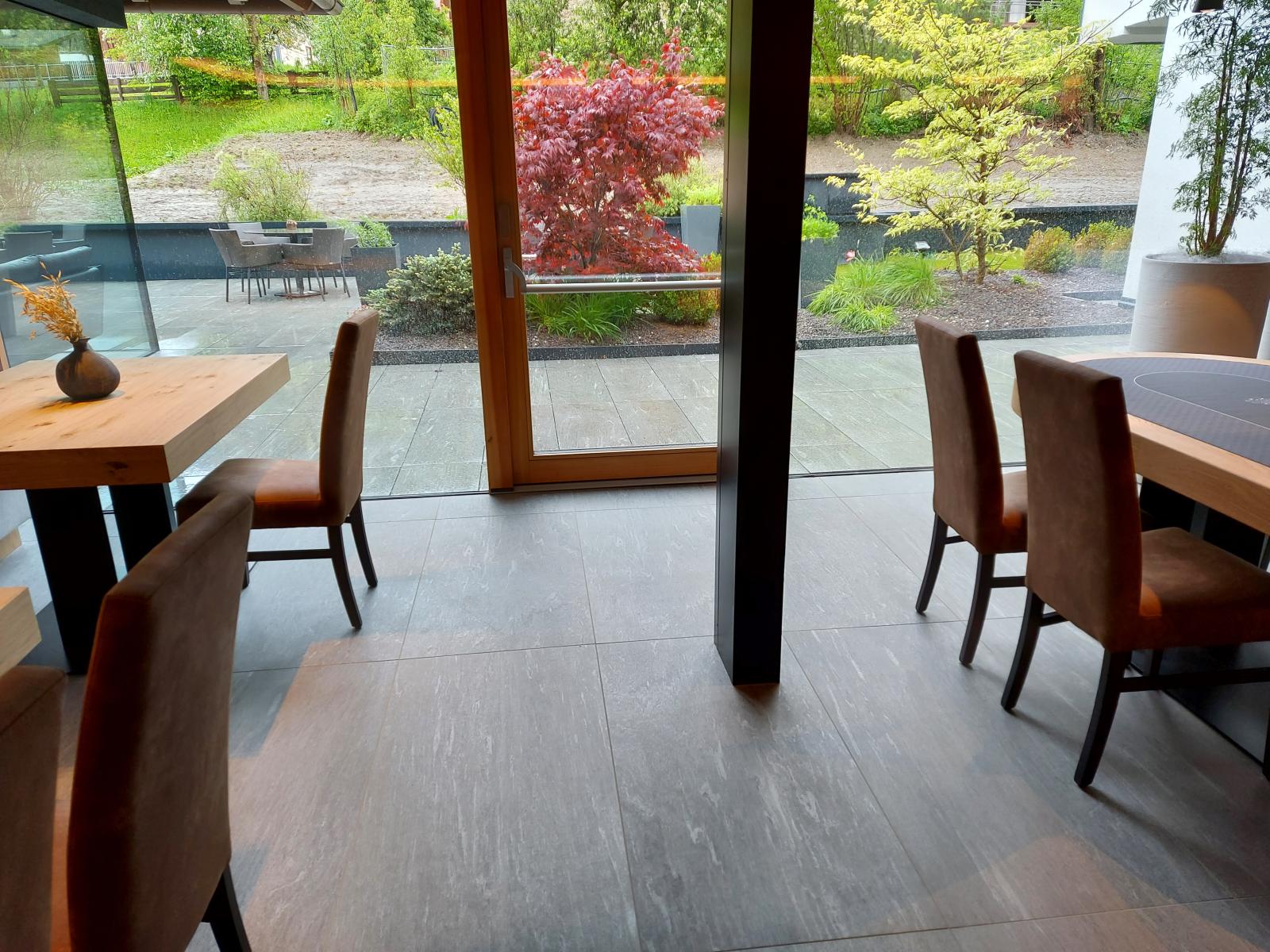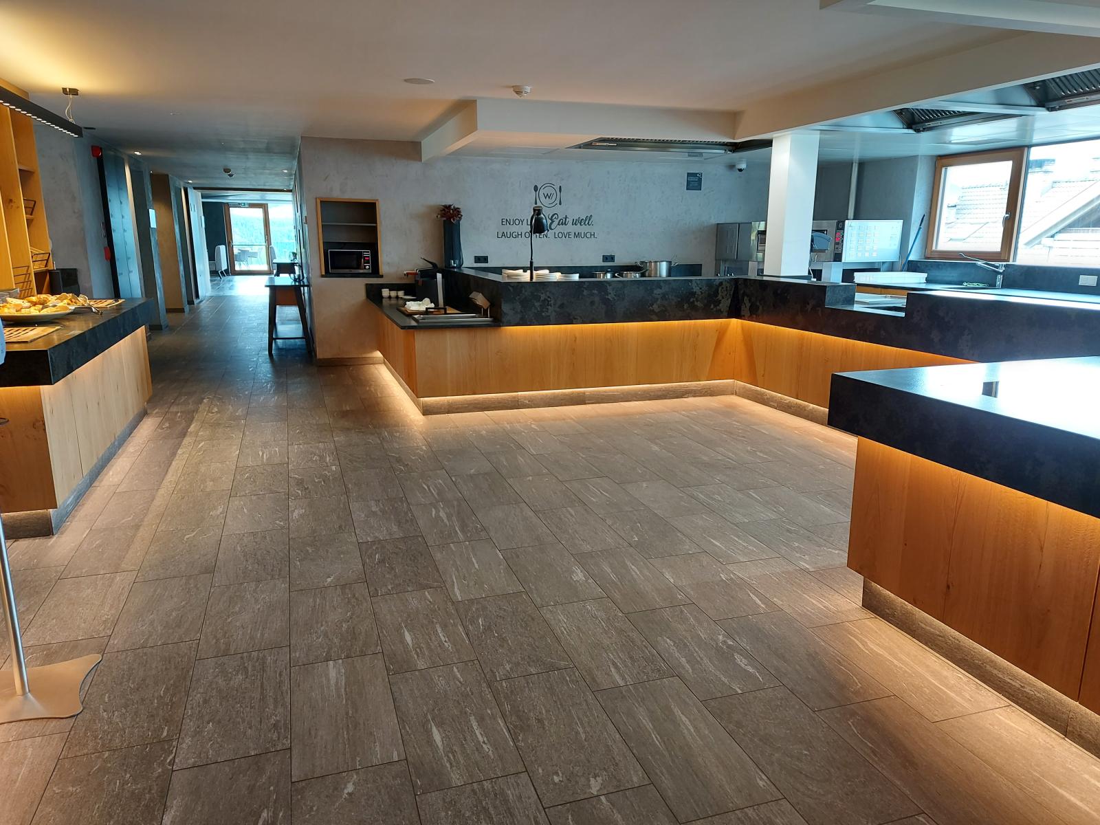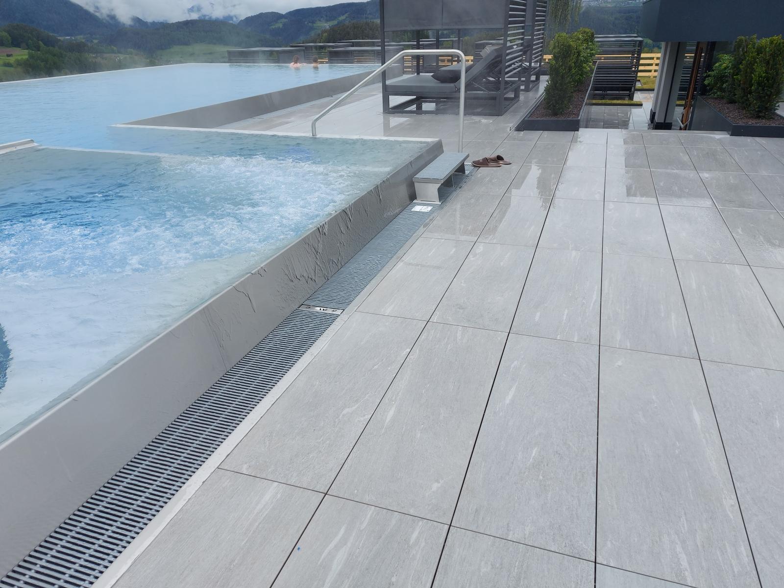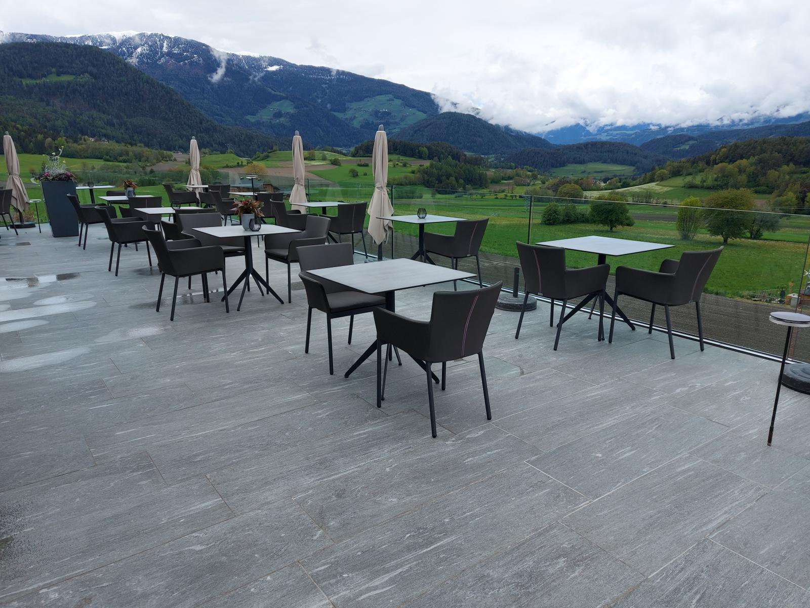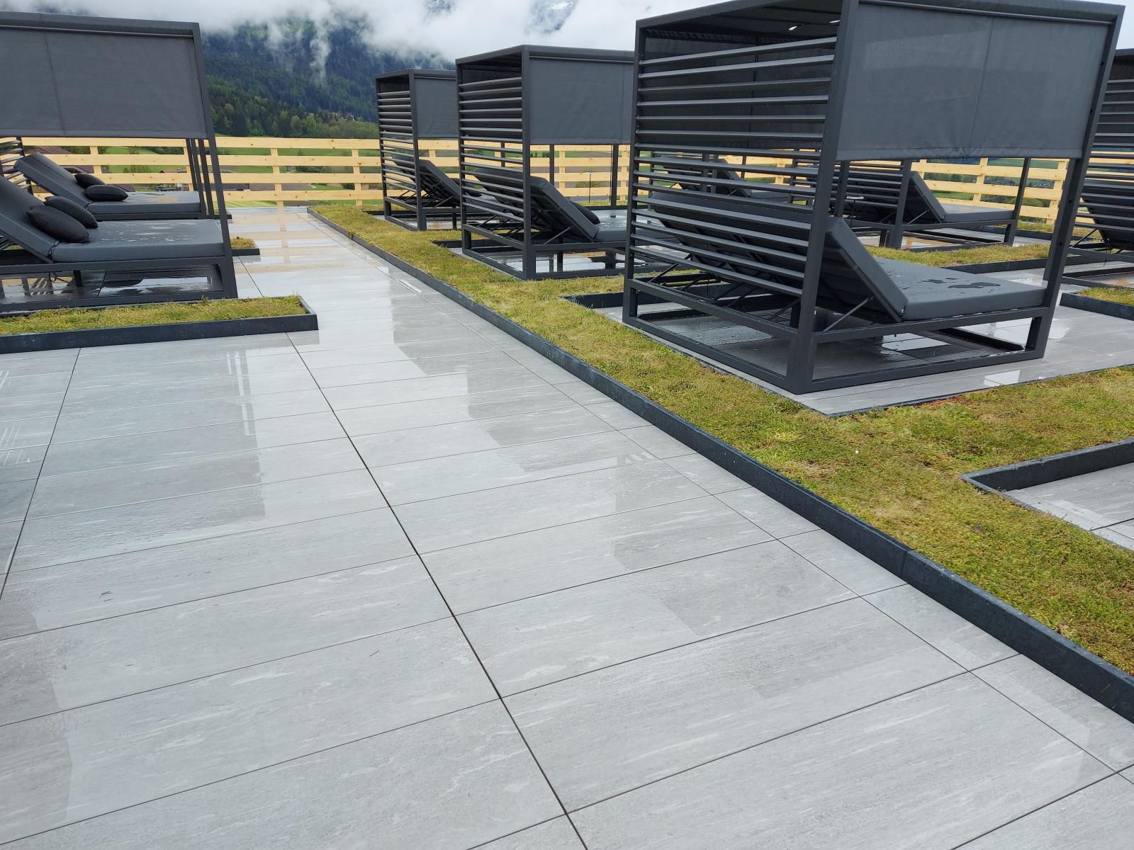 San Lorenzo di Sebato-Winkler Hotel, w którym klient zdecydował się na ułożenie posadzek wewnątrz i zewnątrz z kamienia spiekanego o grubości 2cm z wykorzystaniem kolekcji Harena calanca light Dark 40x120cm