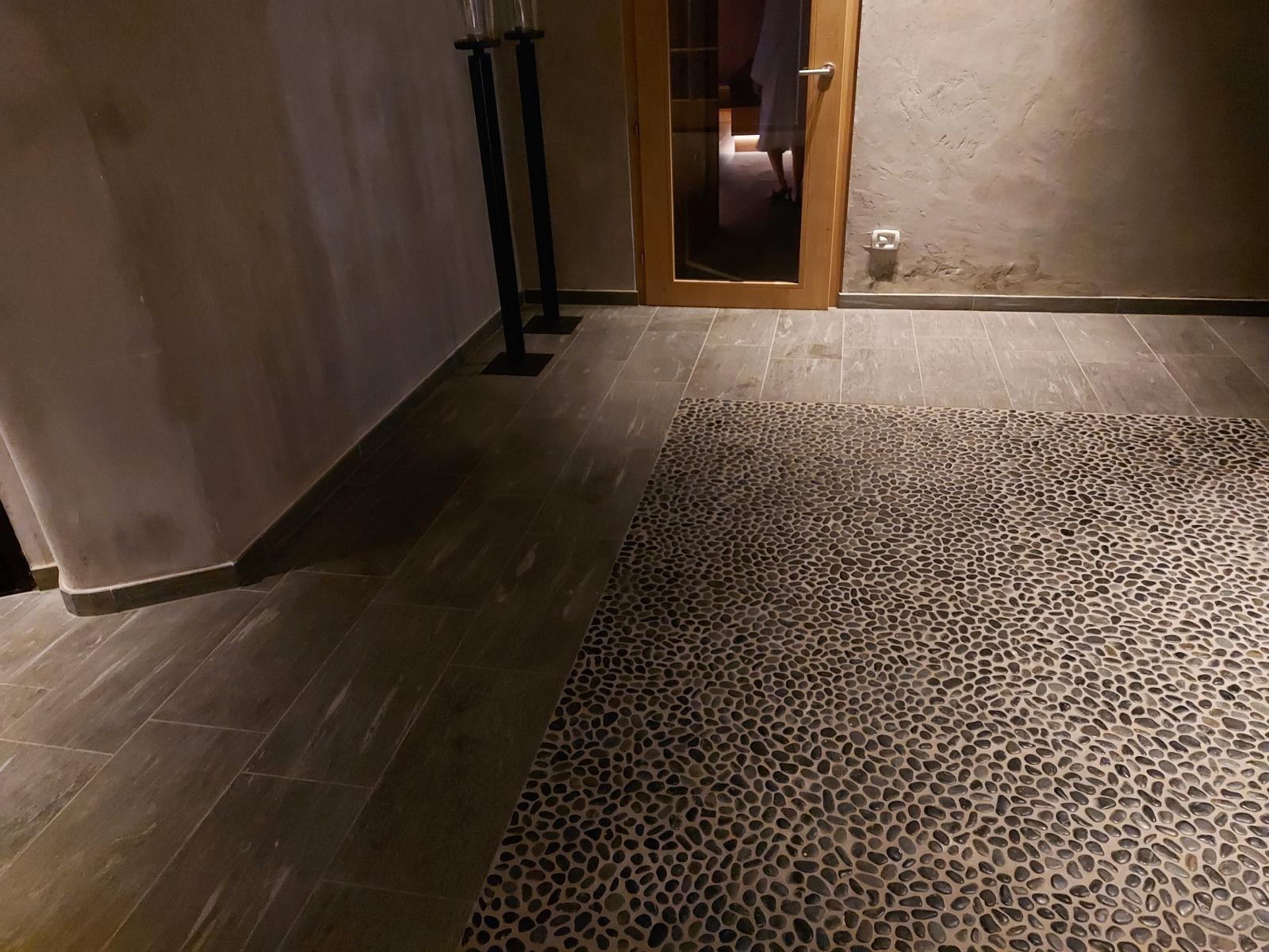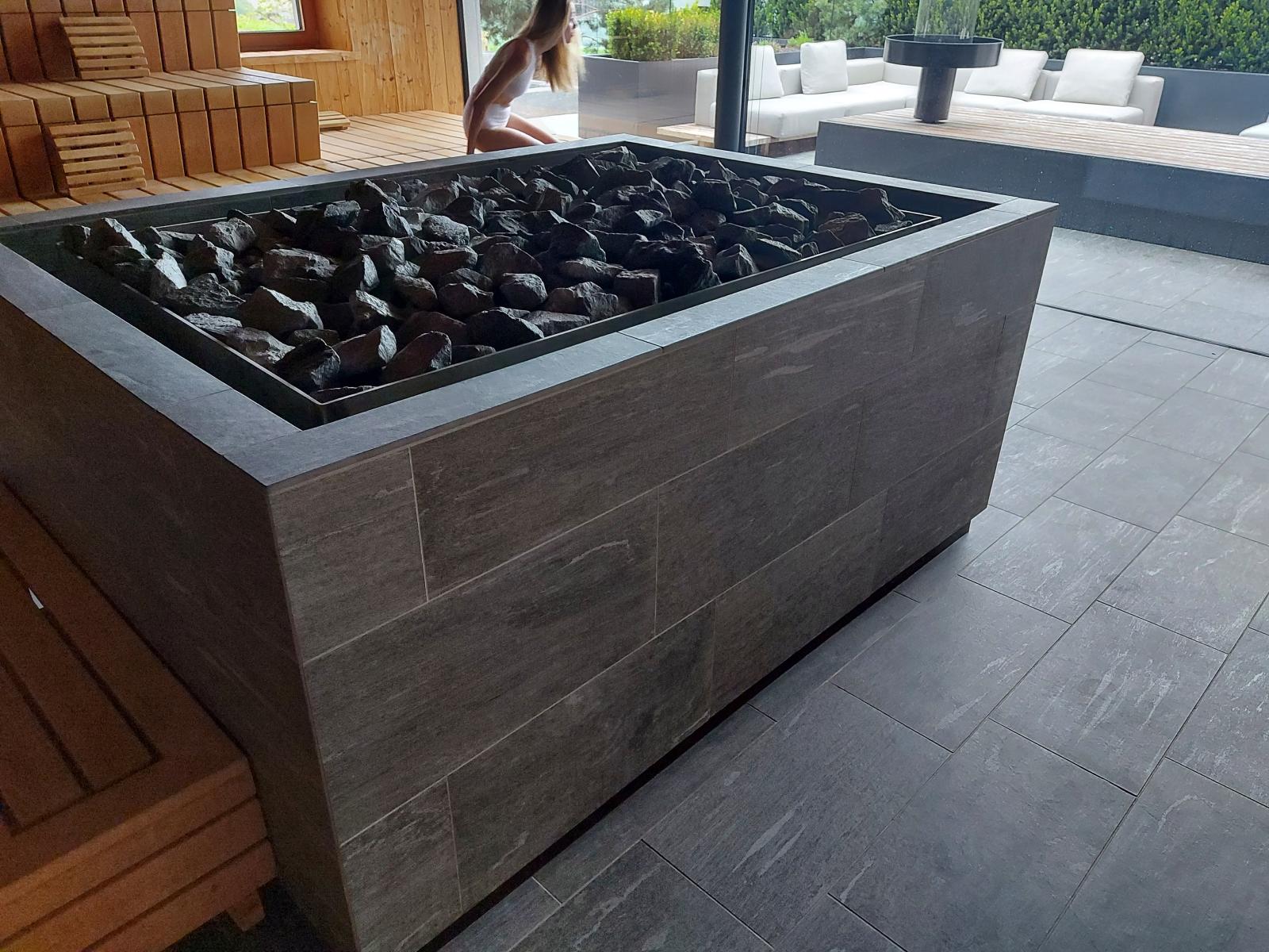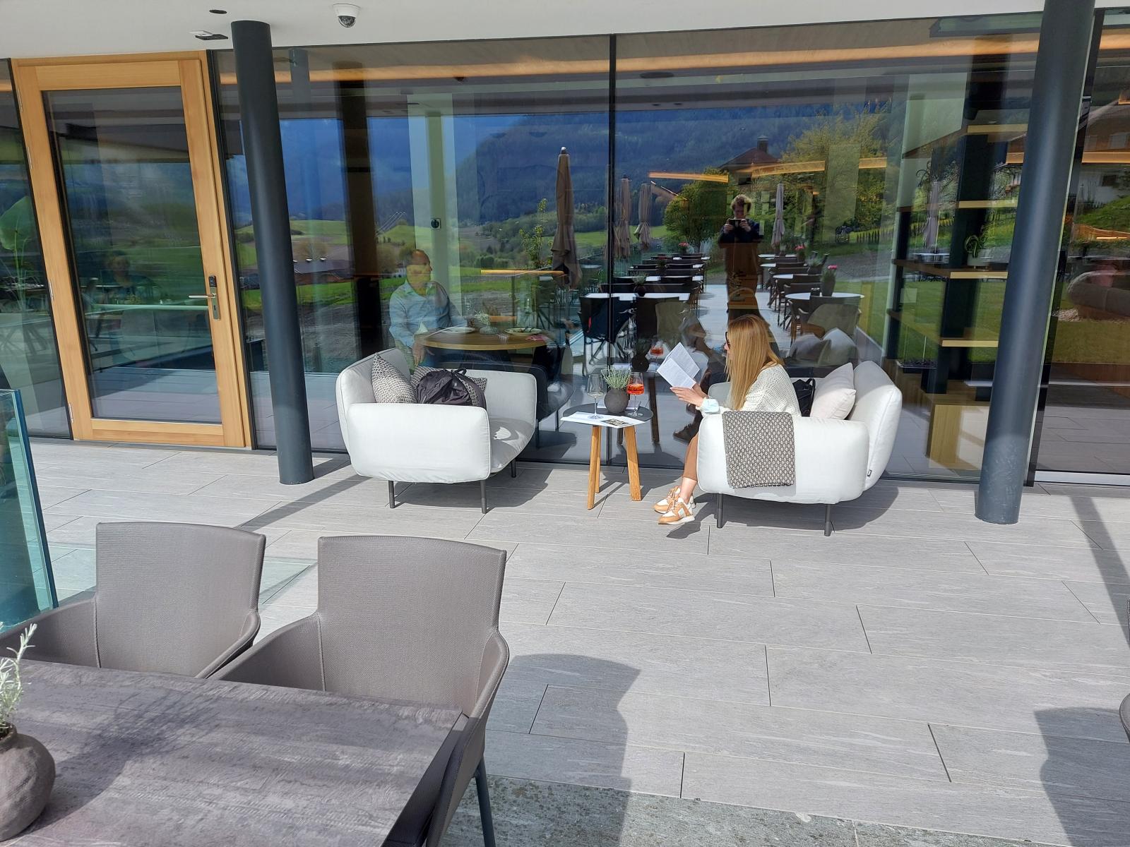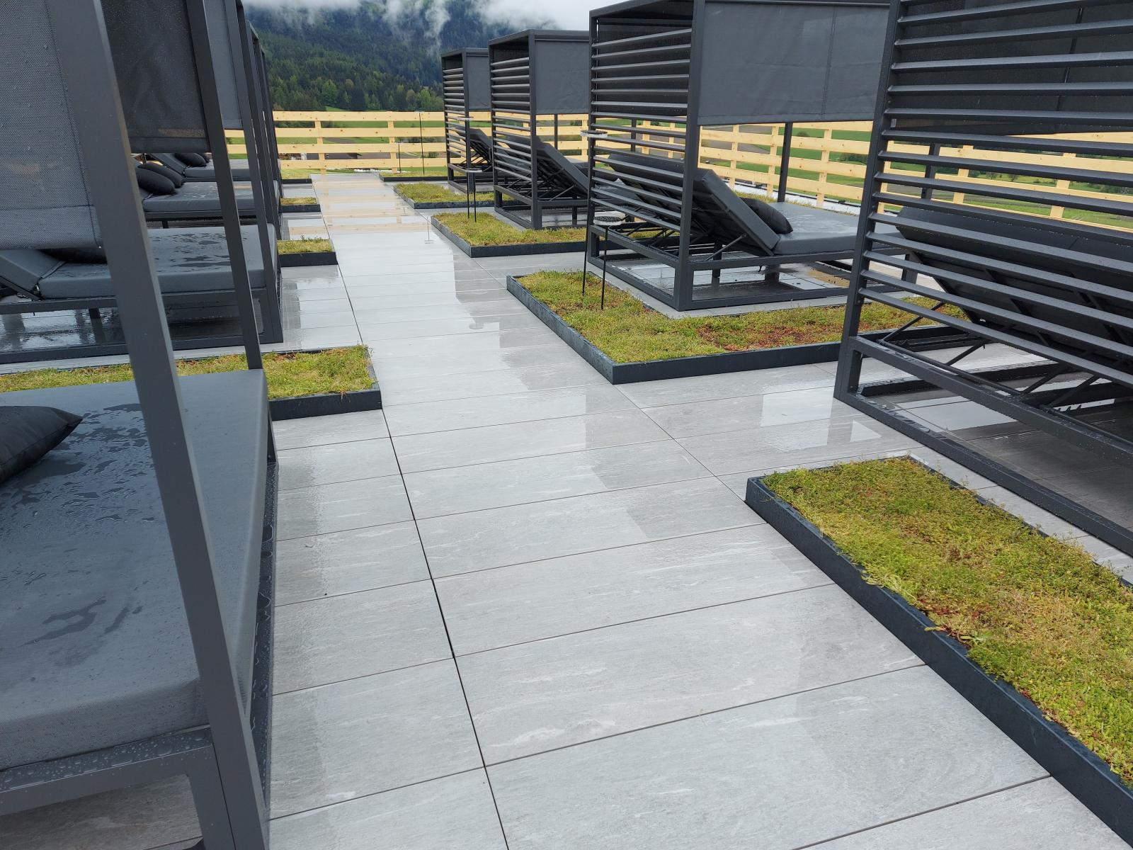 San Lorenzo di Sebato-Winkler Hotel, w którym klient zdecydował się na ułożenie posadzek wewnątrz i zewnątrz z kamienia spiekanego o grubości 2cm z wykorzystaniem kolekcji Harena calanca light Dark 40x120cm