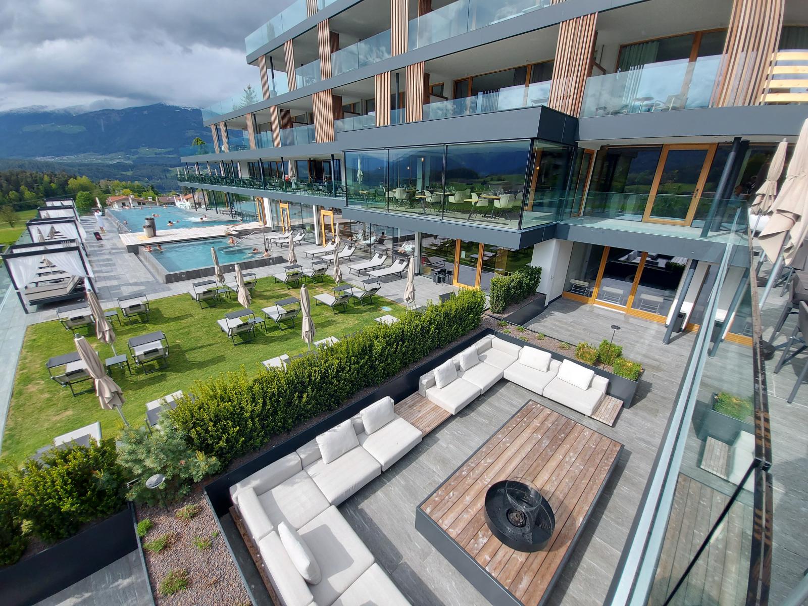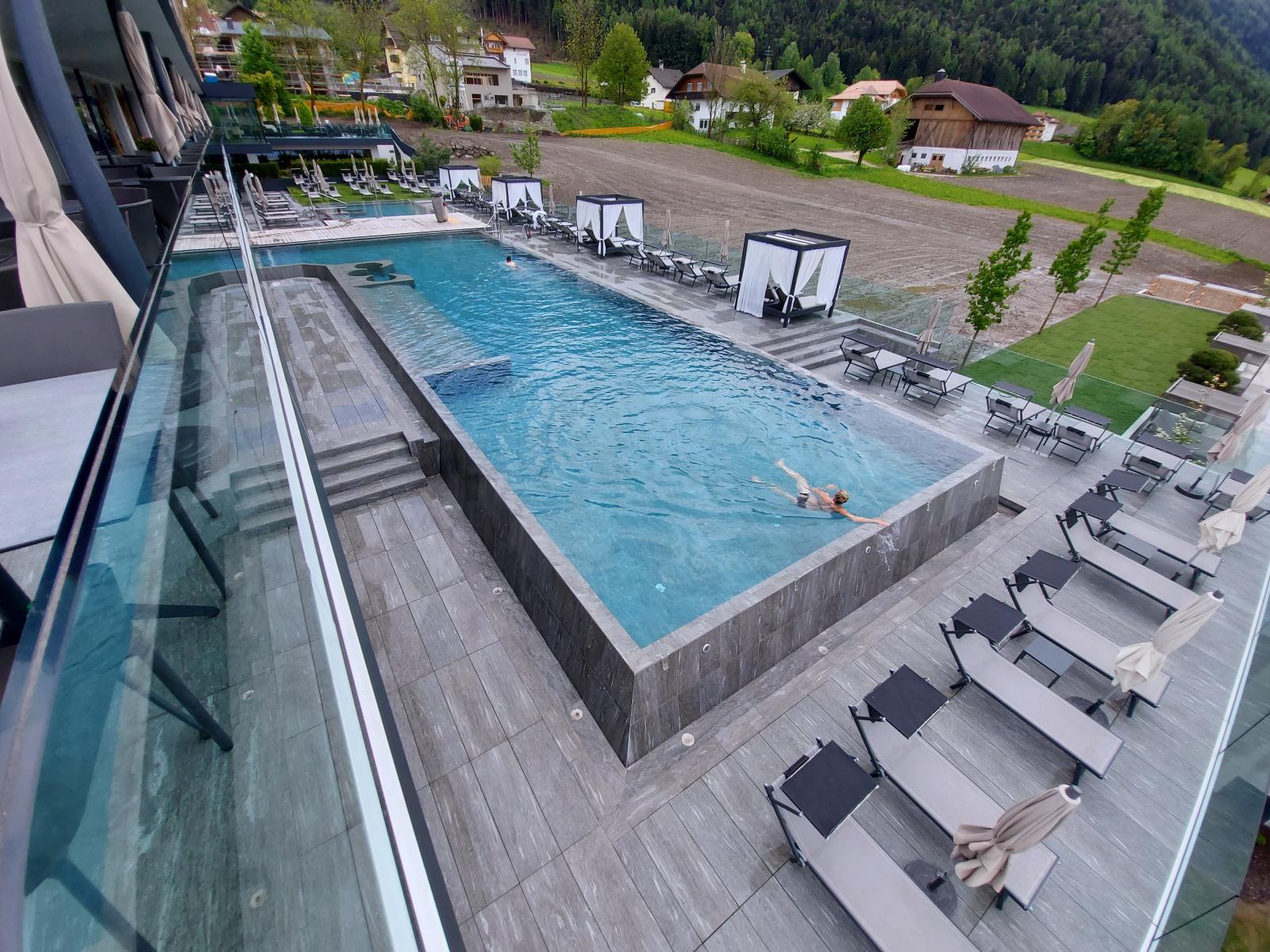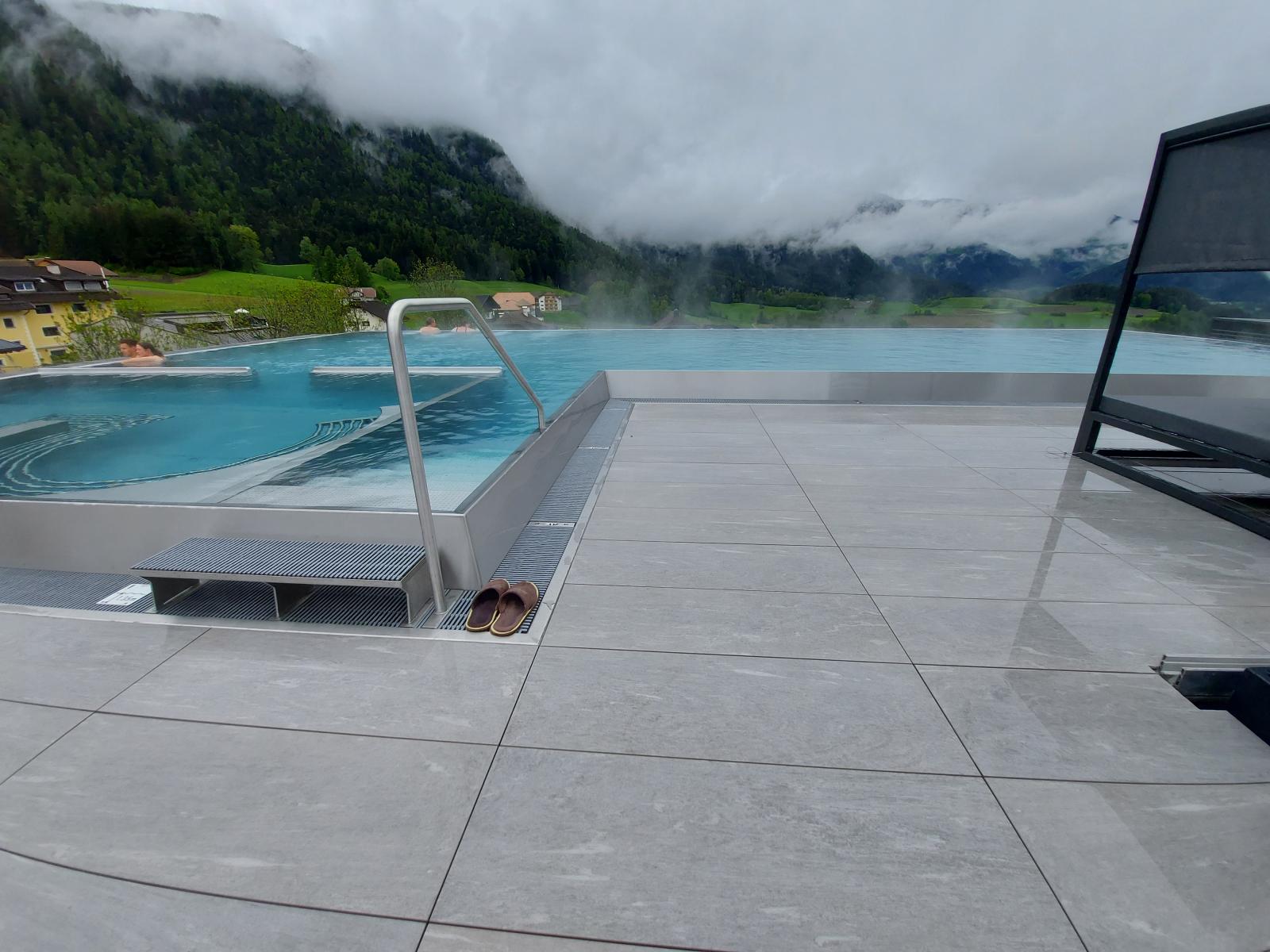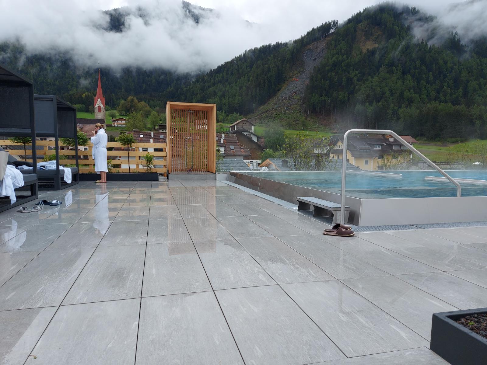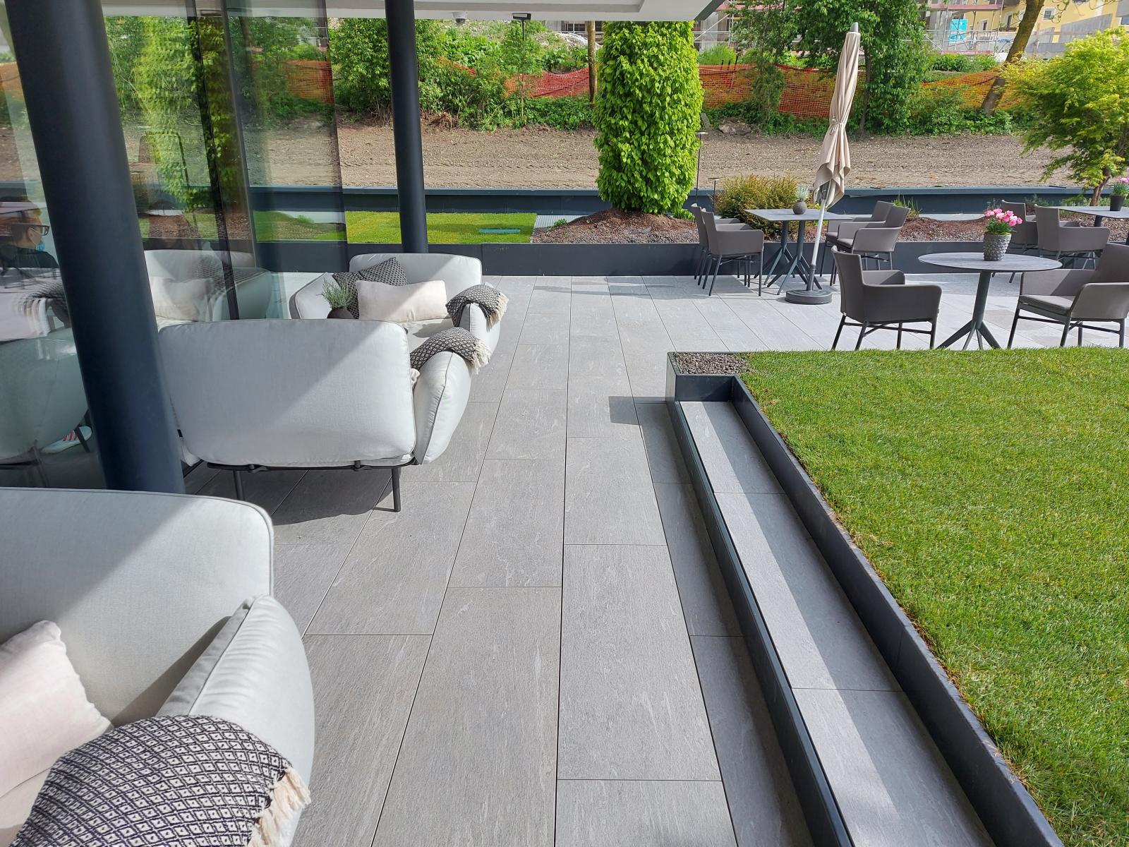 San Lorenzo di Sebato-Winkler Hotel, w którym klient zdecydował się na ułożenie posadzek wewnątrz i zewnątrz z kamienia spiekanego o grubości 2cm z wykorzystaniem kolekcji Harena calanca light Dark 40x120cm