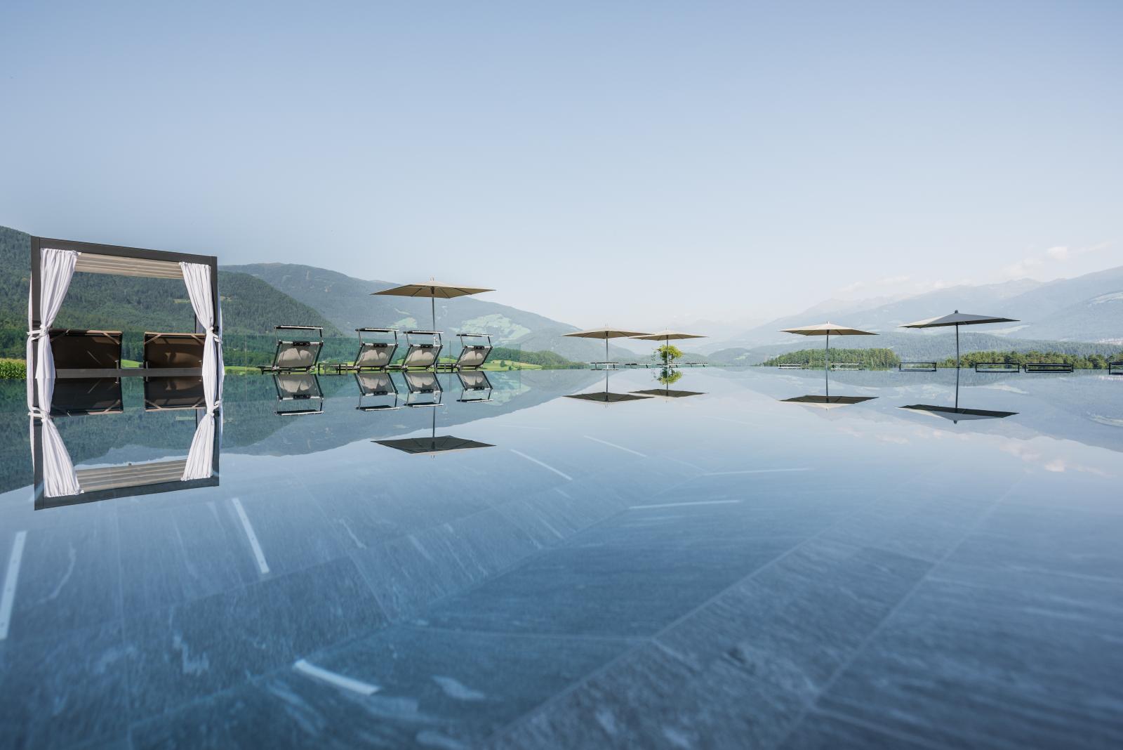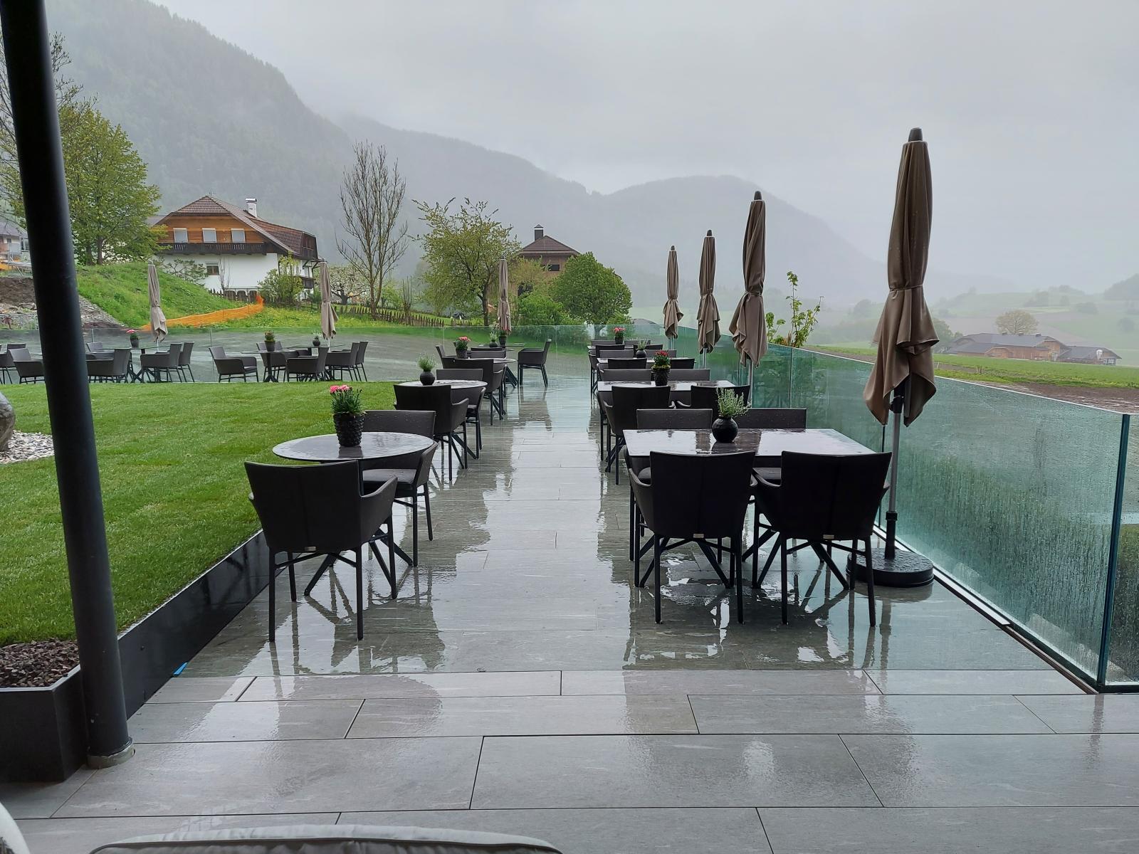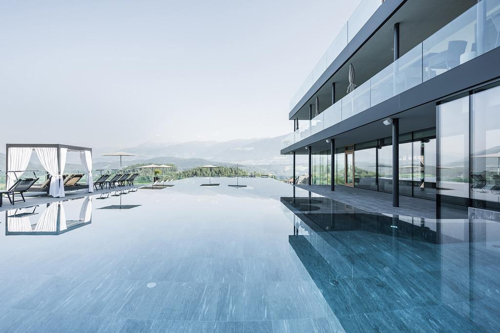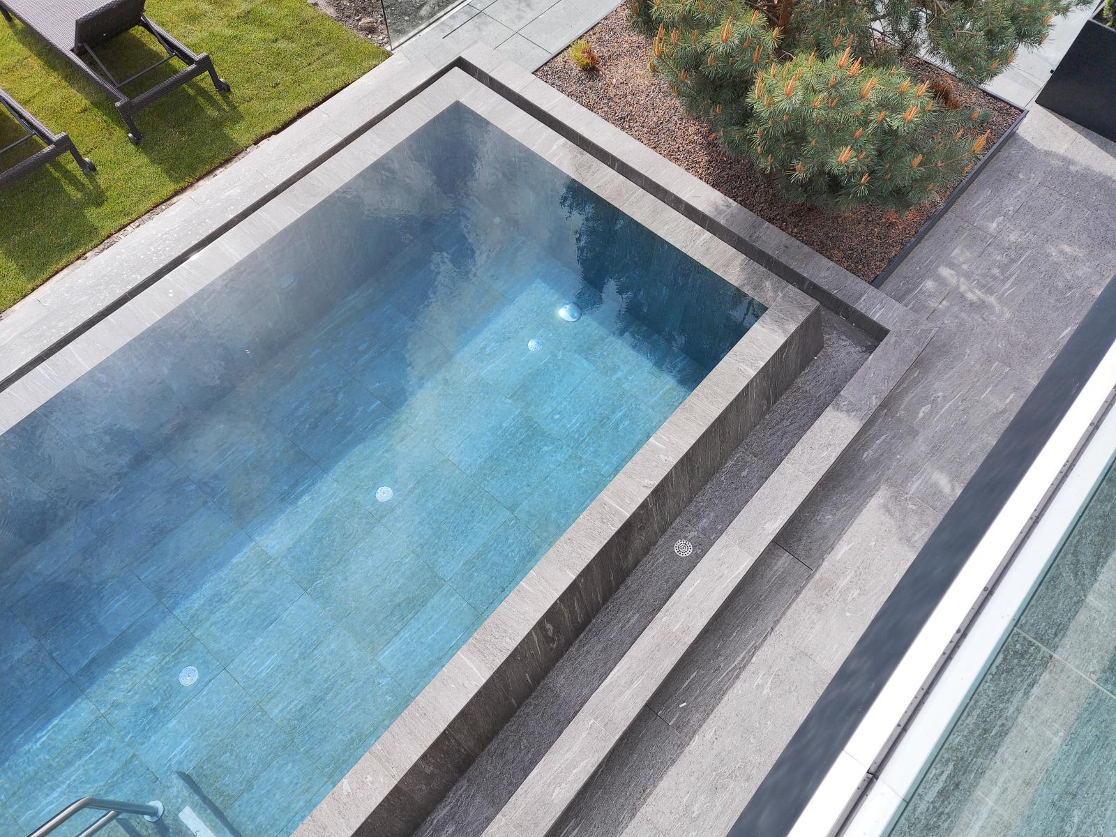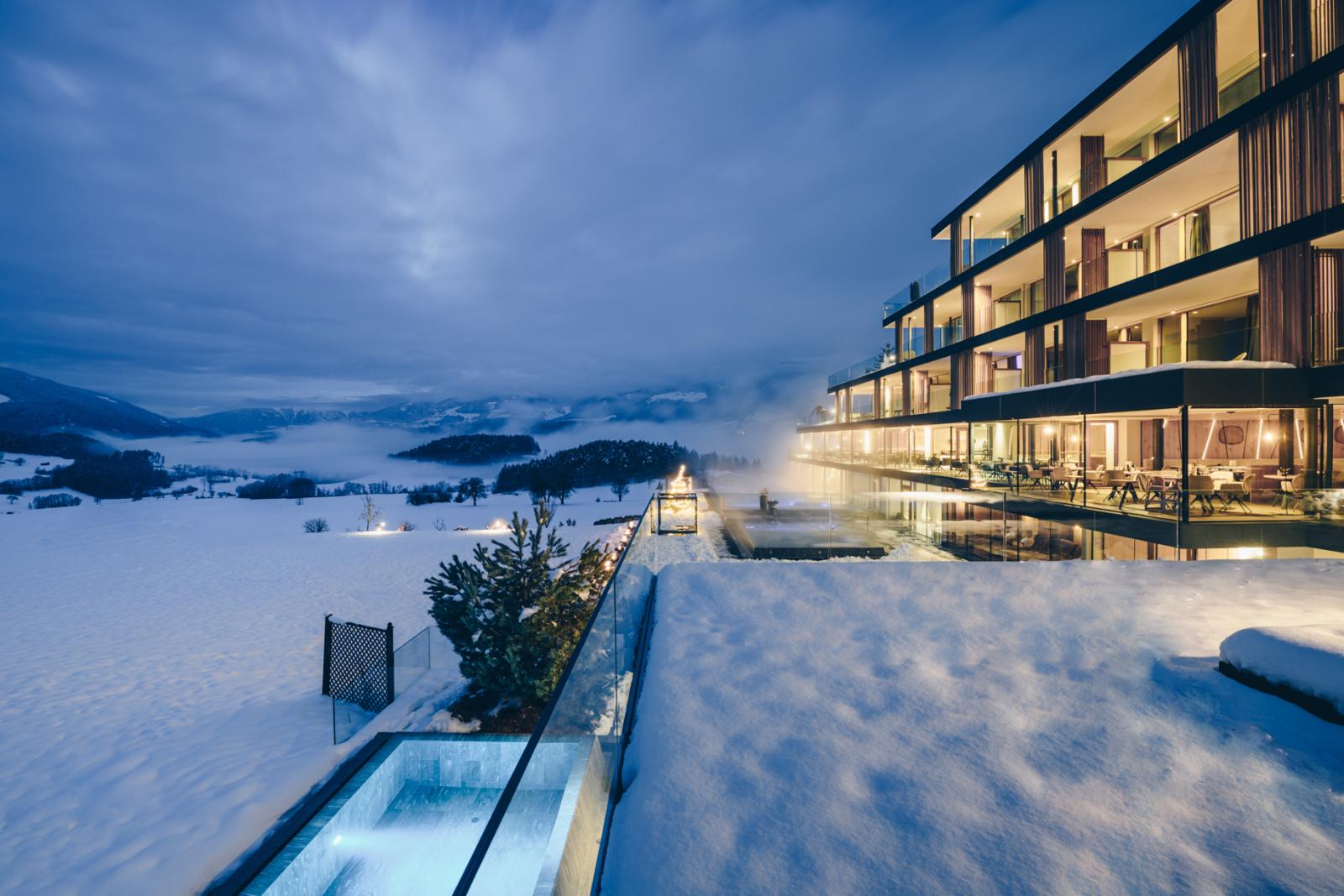 San Lorenzo di Sebato-Winkler Hotel, w którym klient zdecydował się na ułożenie posadzek wewnątrz i zewnątrz z kamienia spiekanego o grubości 2cm z wykorzystaniem kolekcji Harena calanca light Dark 40x120cm