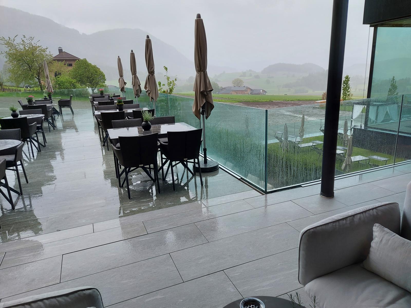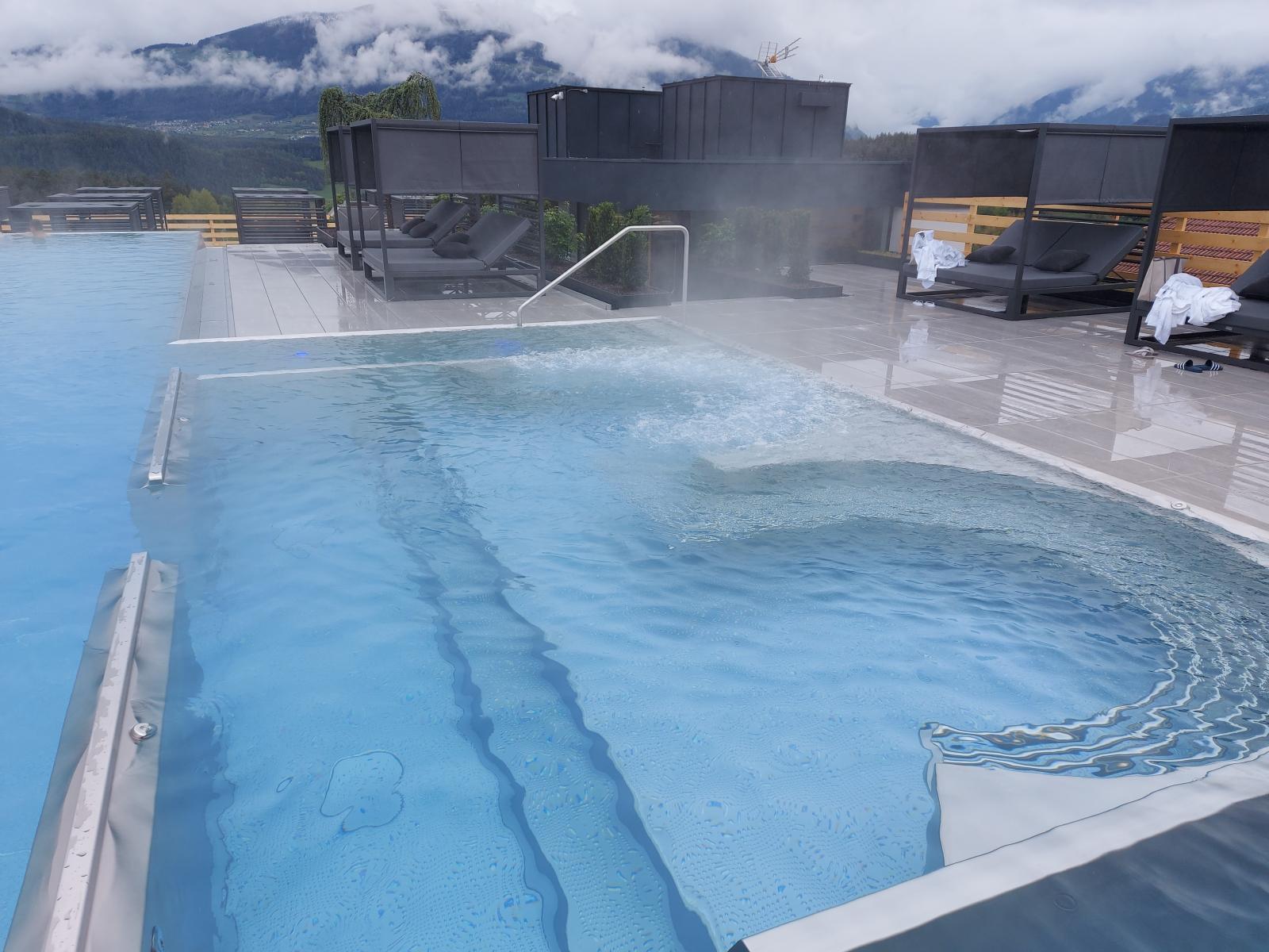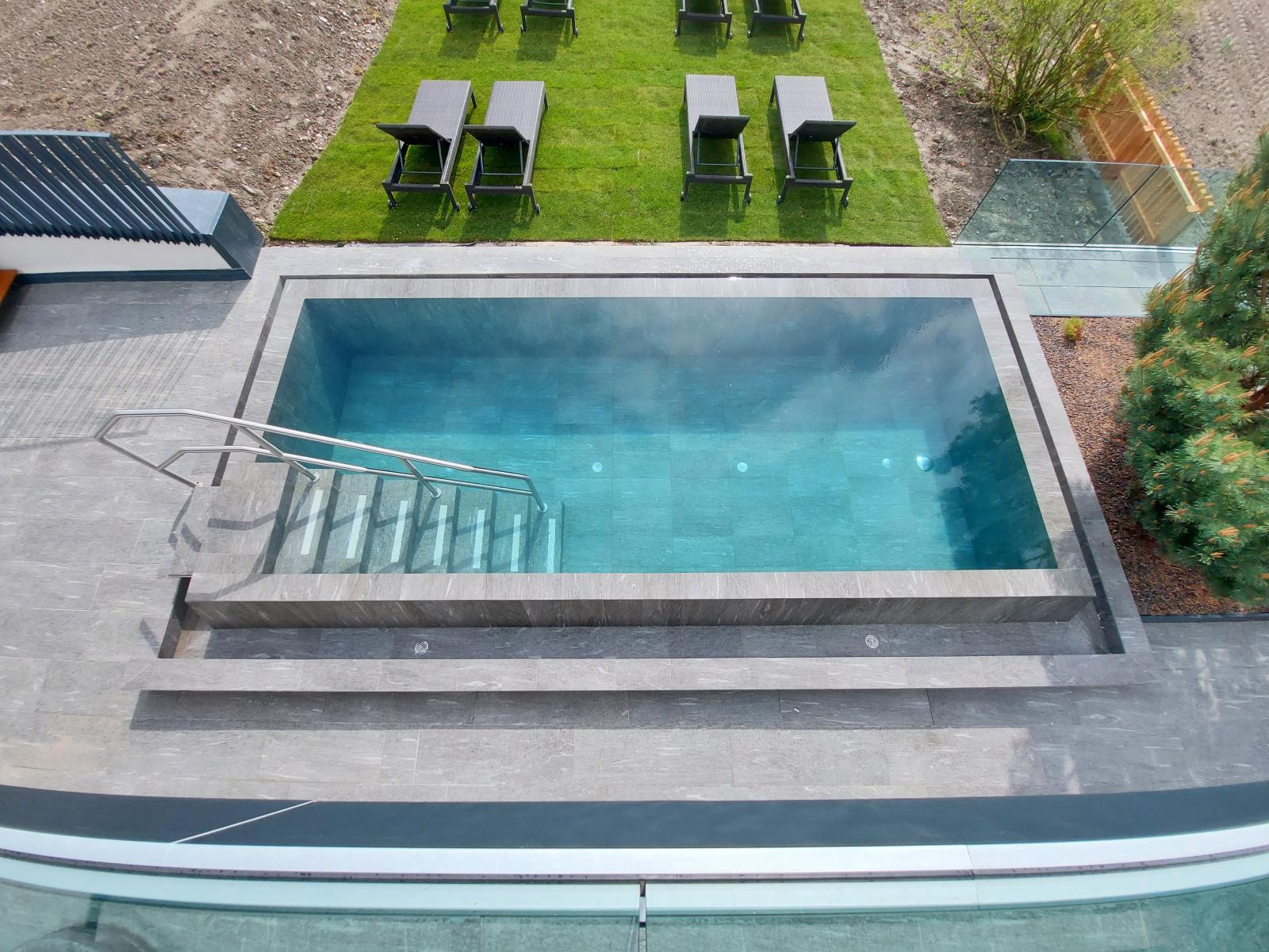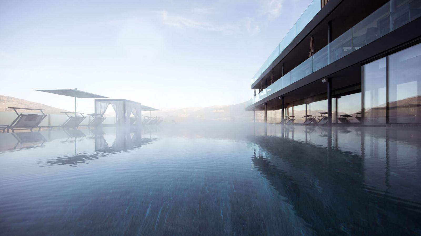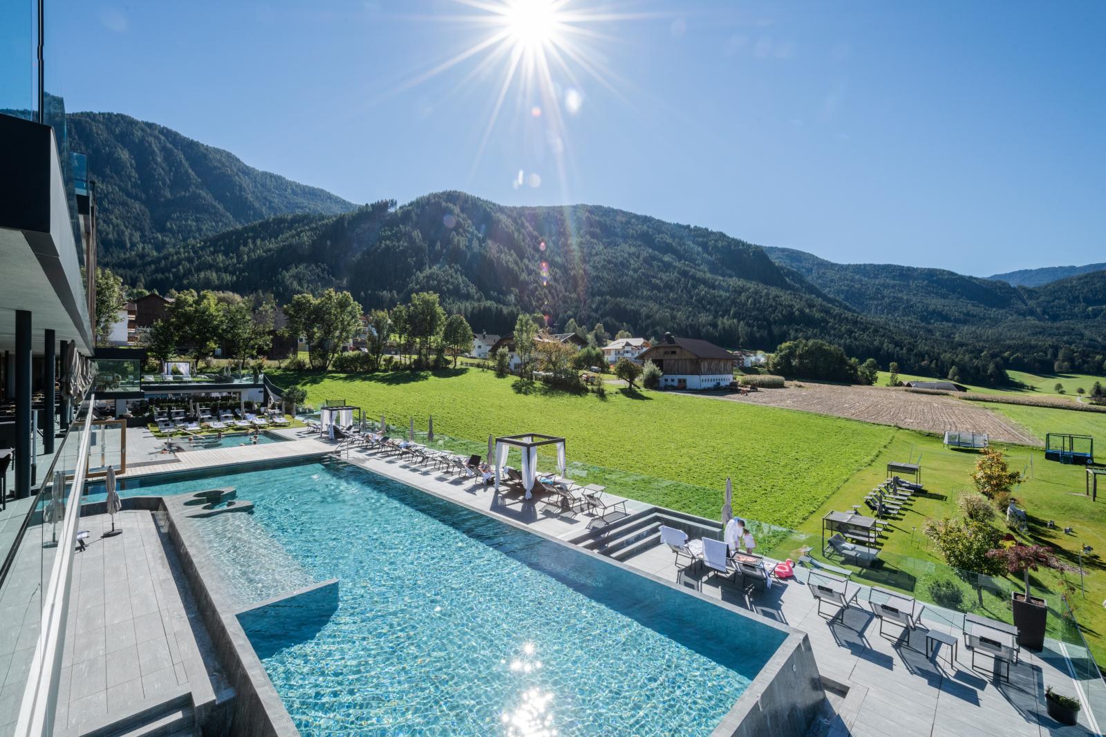San Lorenzo di Sebato-Winkler Hotel, w którym klient zdecydował się na ułożenie posadzek wewnątrz i zewnątrz z kamienia spiekanego o grubości 2cm z wykorzystaniem kolekcji Harena calanca light Dark 40x120cm