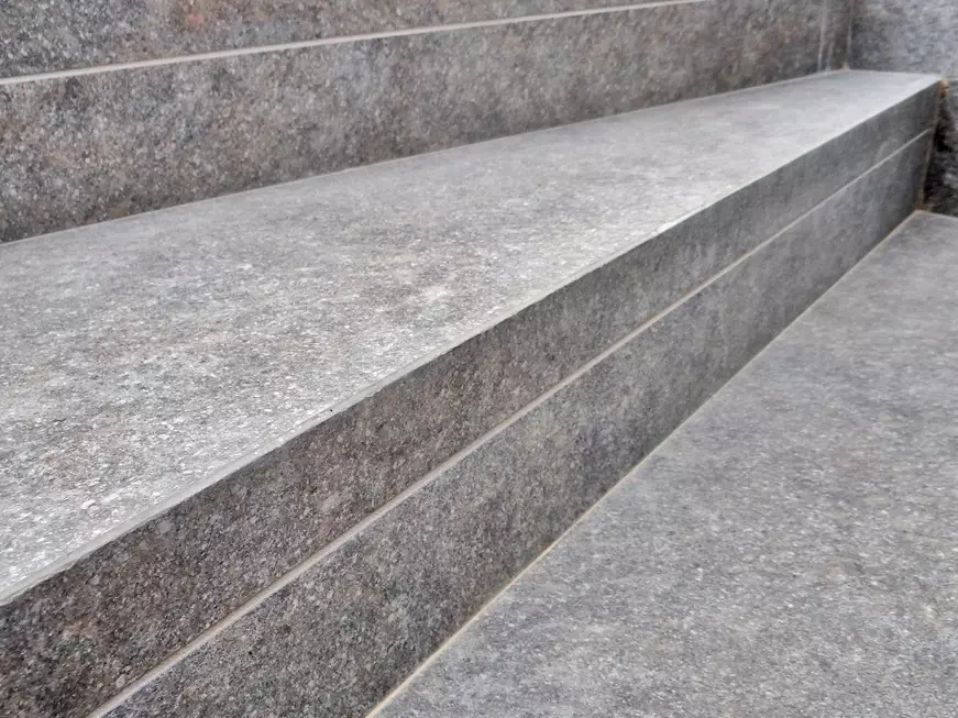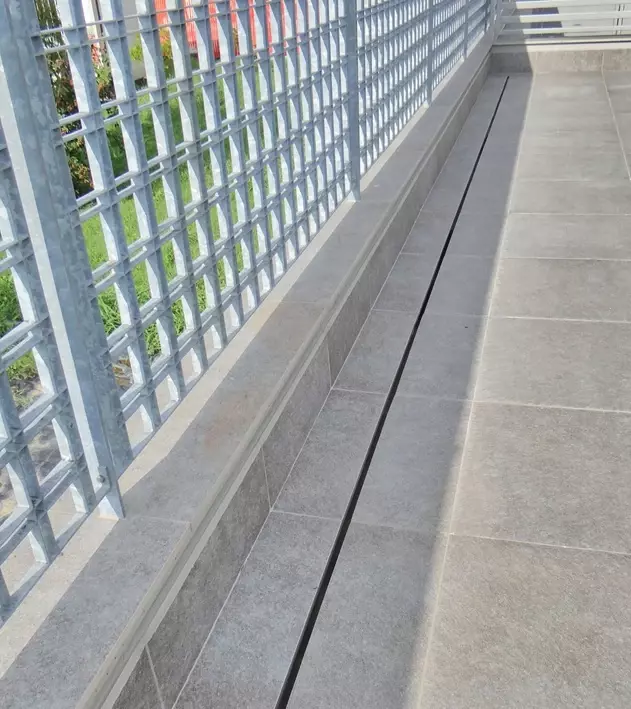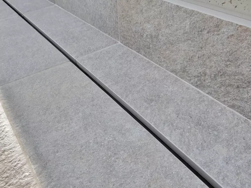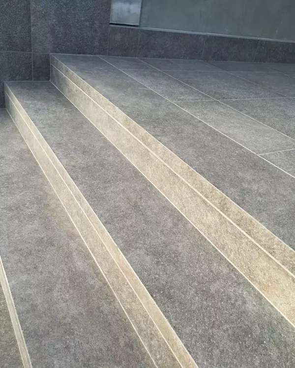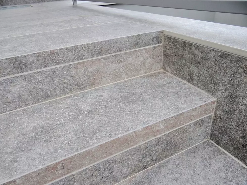 Gotowe stopnie schodowe, które ułatwiają szybki montaż. W przypadku tak wymagających projektów jak ten, klient zdecydował się na schody trapezowe, a w niektórych miejscach wręcz przypominają one schody spiralne, które dodają nowoczesnego charakteru bryle budynku. Niezależnie od kształtu, kluczowe jest, by schody zapewniały bezpieczeństwo korzystania, komfort i estetykę. Szerokość stopnia w miejscach najczęściej użytkowanych wynosi ponad 40cm co daje duży komfort chodzenia. Stopnie mają tez optymalną wysokość przez co przechodzi się po nich płynnie. Do wykonania schodów zastosowano wyłącznie materiały mrozoodporne, co gwarantuje ich odporność na zmienne warunki atmosferyczne. To właśnie dzięki takim rozwiązaniom gres doskonale sprawdza się w polskim klimacie.