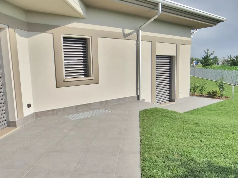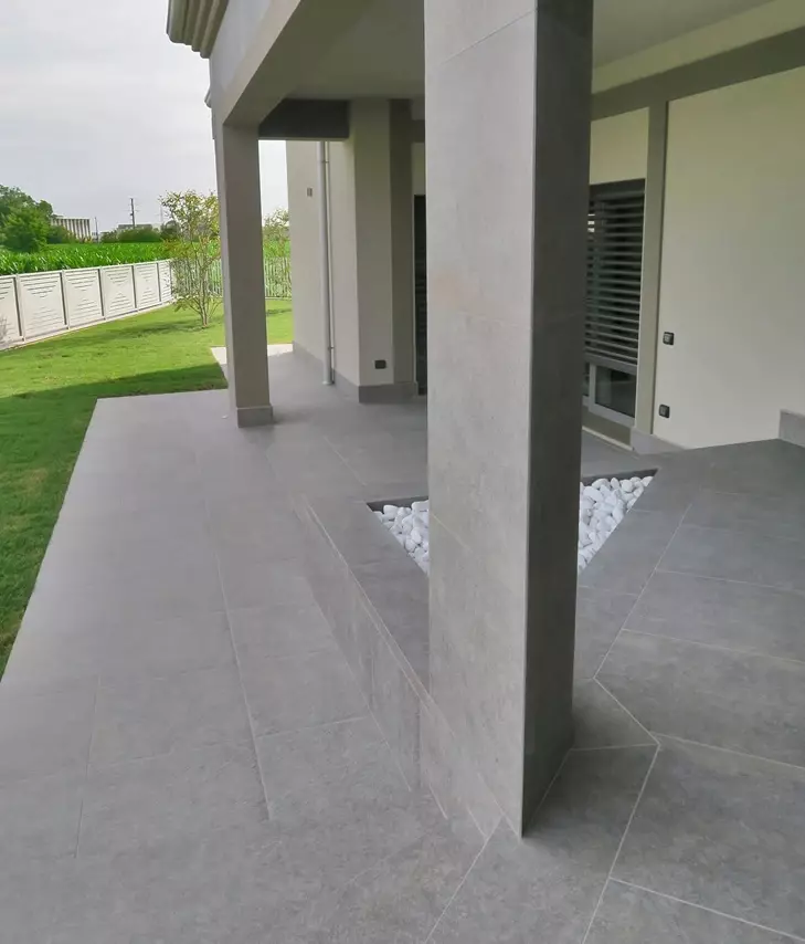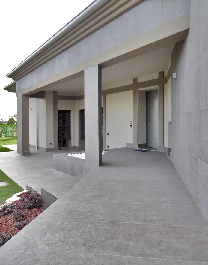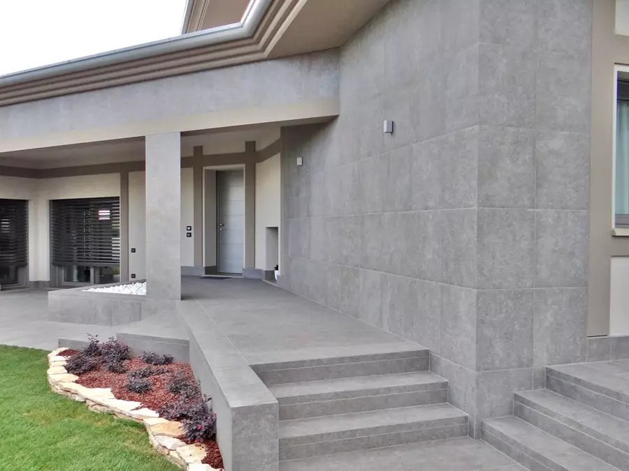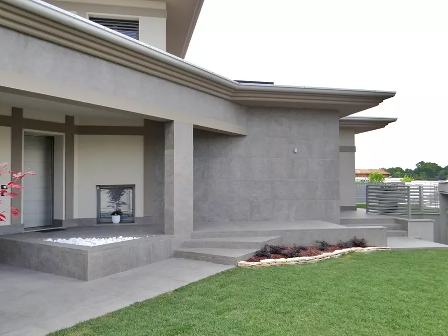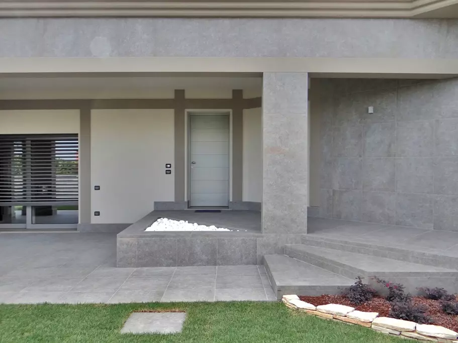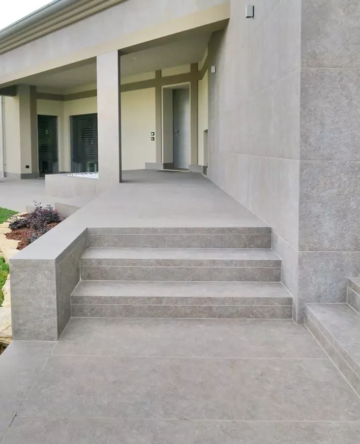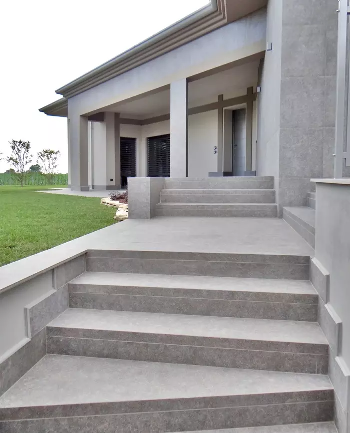 Podczas projektowania schodów ważne jest, aby odpowiednio dopasować schody do bryły domu i jego otoczenia. Dlatego w tej realizacji projektanci zwrócili uwagę na wysokość schodów, proporcje oraz wykończenie krawędzi. Schody zewnętrzne muszą nie tylko prezentować się elegancko, ale również być komfortowe w codziennym użytkowaniu. W tym domu schody zewnętrzne betonowe wyłożono płytami tarasowymi o wymiarach 60x120 i 60x60 cm. Rodzaj okładziny to płytka gresowa Colosseo Porfidolavis. Stopnie zostały wykonane na zamówienie tak aby ich czoło przypominało naturalny kamień innymi słowy aby schody przypominały schody zewnętrzne kamienne .