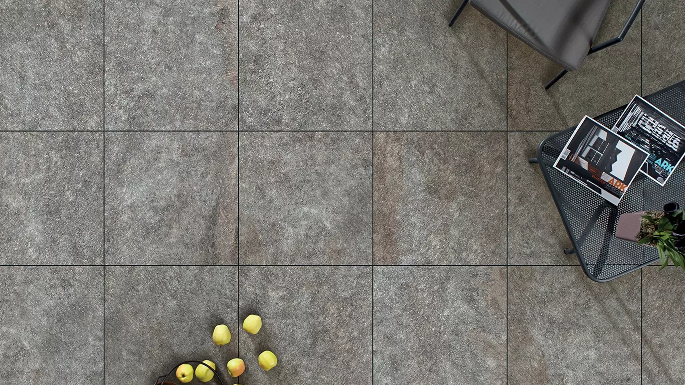 Zdjęcie z salonu Płytka inspirowana naturalnym porfirem z Lavis– wyjątkowo twardym, wulkanicznym kamieniem. Porfir z Lavis jest znany w całych Włoszech i Europie jako materiał budowlany i dekoracyjny, szczególnie ceniony za wysoką odporność na ścieranie, mróz i warunki atmosferyczne czyli cechy, które posiadają płytki gresowe. Powierzchnia płytki została zaprojektowana tak aby oddać naturalne zróżnicowanie kolorów od szarości i czerwieni po fiolet i brąz.