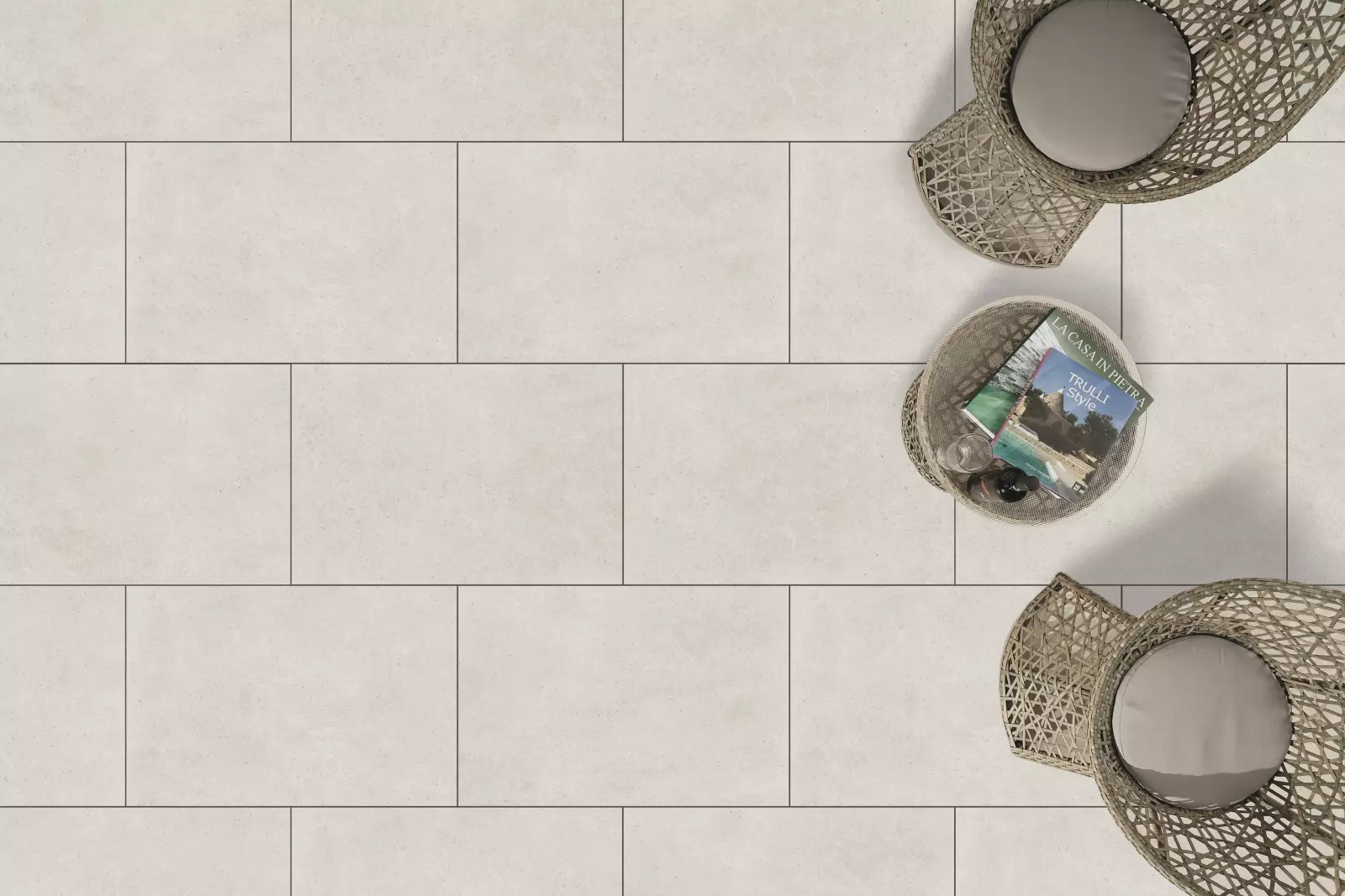 Zdjęcie z salonu Jasna płytka tarasowa, inspirowana dorsetskim wapieniem (Dorset limestone) – jasnym, kremowo-beżowym kamieniem pochodzącym z południowej Anglii, w szczególności z hrabstwa Dorset, słynącego z wapiennych klifów i unikalnych formacji geologicznych. Powierzchnia płytki zachwyca kolorem kości słoniowej z akcentami beżu i jasnej szarości, tworząc harmonijną, kompozycję idealną na tarasy i balkony.